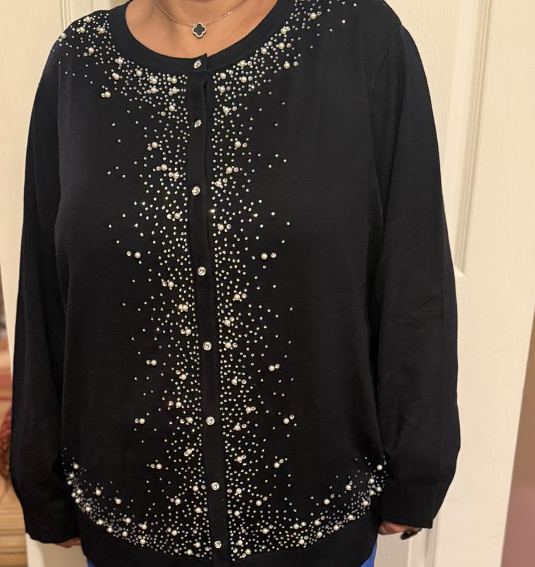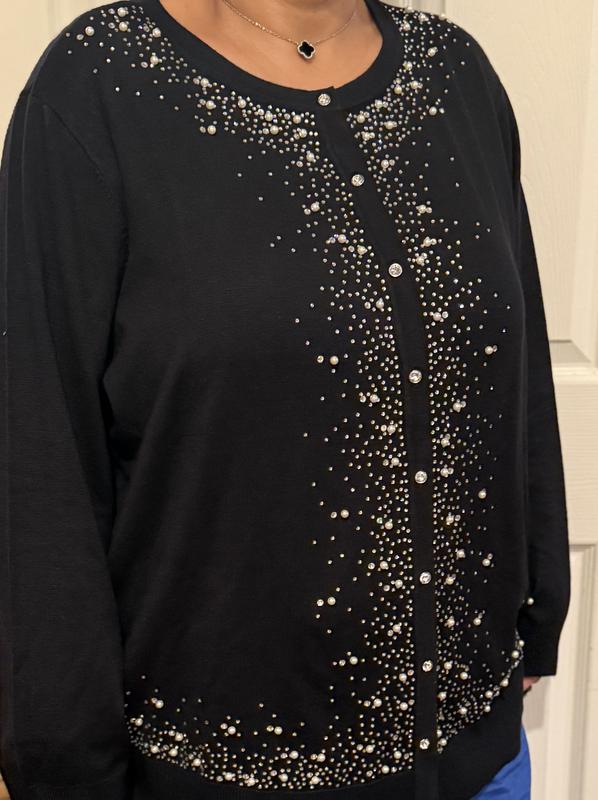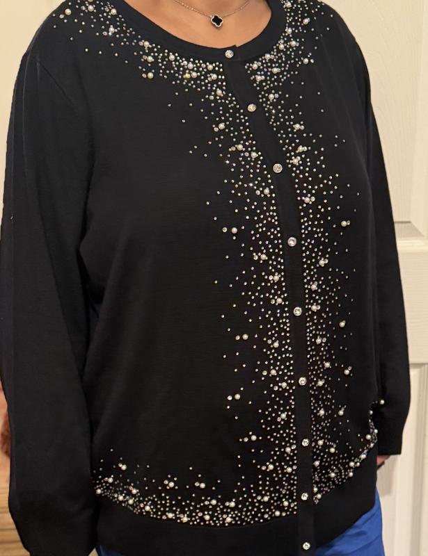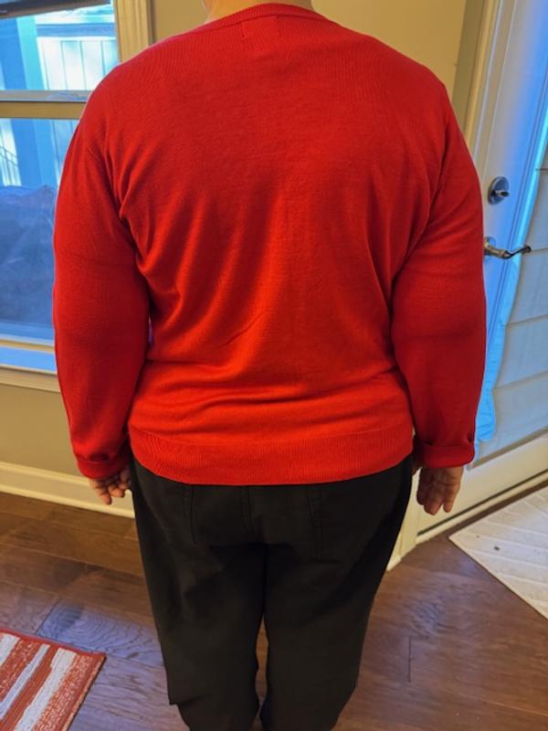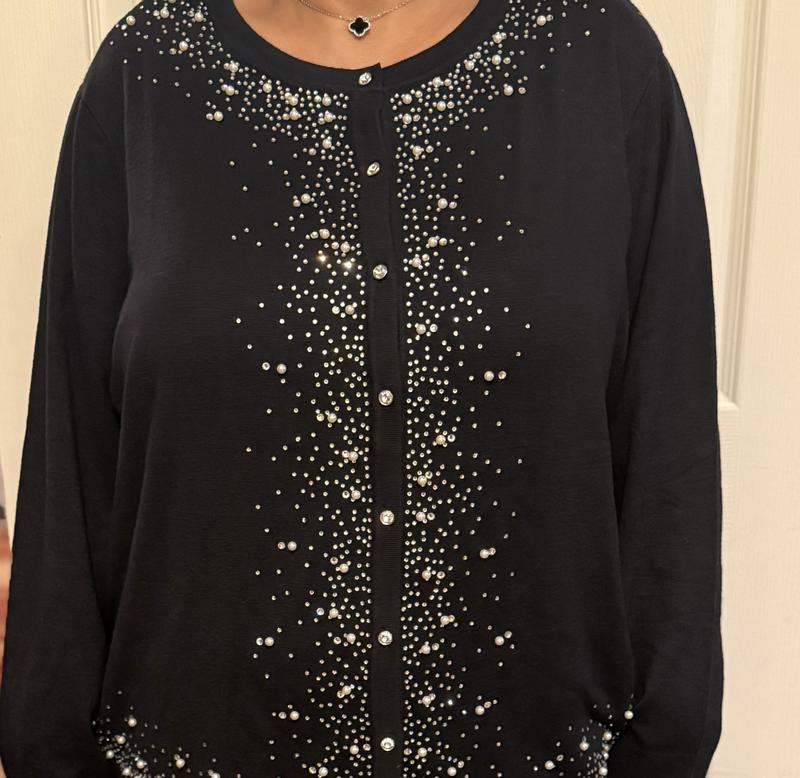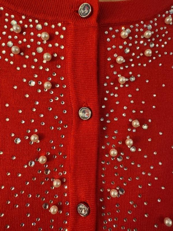 This embellished red sweater is absolutely a knock out! MUCH nicer than expected; it is soft, fits true to size (I am an 18/20 & can wear this buttoned up) and is perfect for the holidays. My best purchase this year!