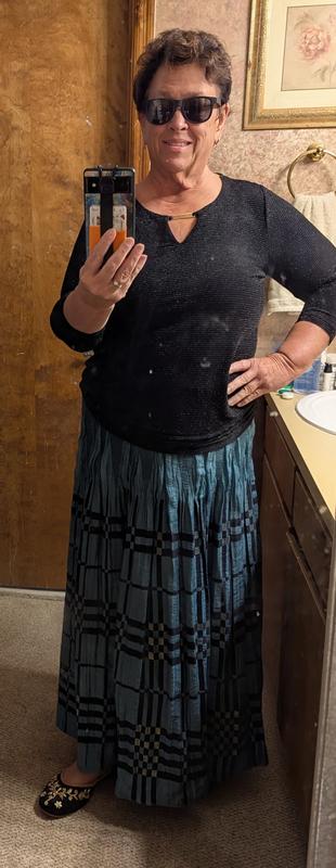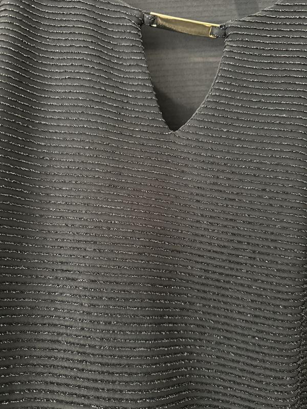 This is definitely a blouse for a holiday. The material is metallic and definitely a little glitzy. There’s a metal piece across the Cut out collar, but it is not cut too low. Sleeves are three-quarter. There’s stretch to the material, but this runs a little small. It doesn’t drop over the body. I have not washed it yet.