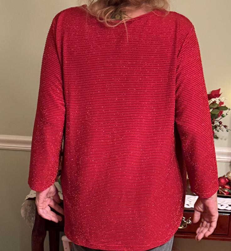 This is a very nice top, especially for the holidays. The sparkle adds a nice touch. Fabric feels good quality and it’s stretchy. It does run small. I normally wear a 1X and based on the fit on the model, who is wearing a 2X, I ordered a 2X and it is just right.