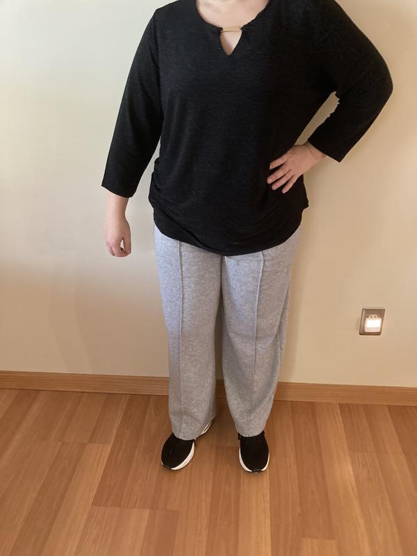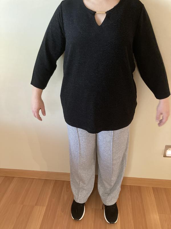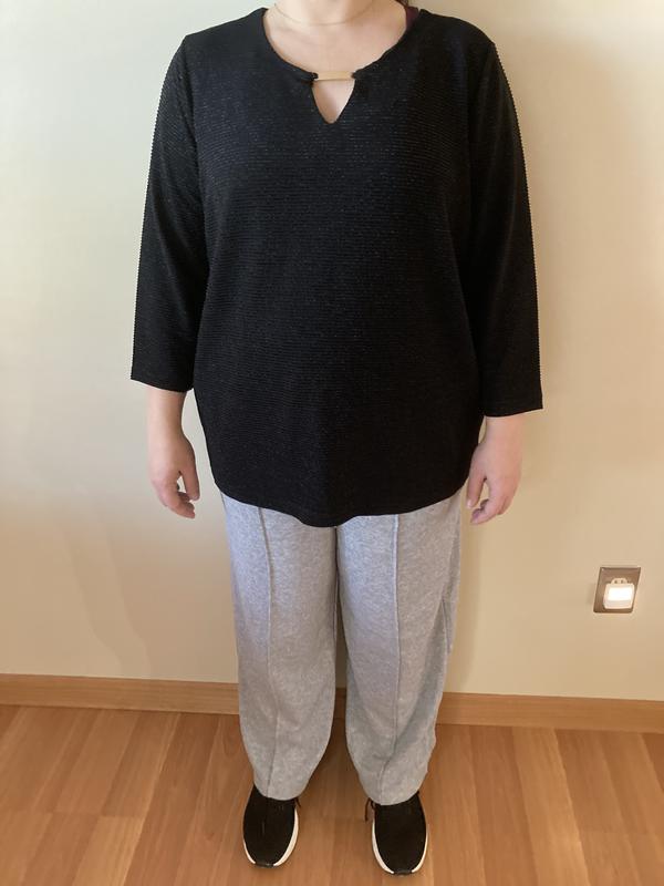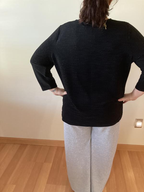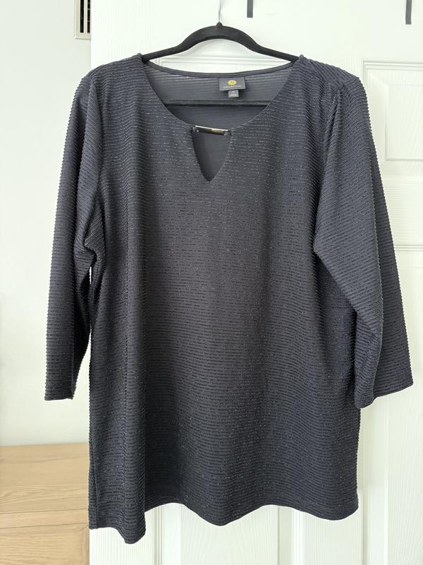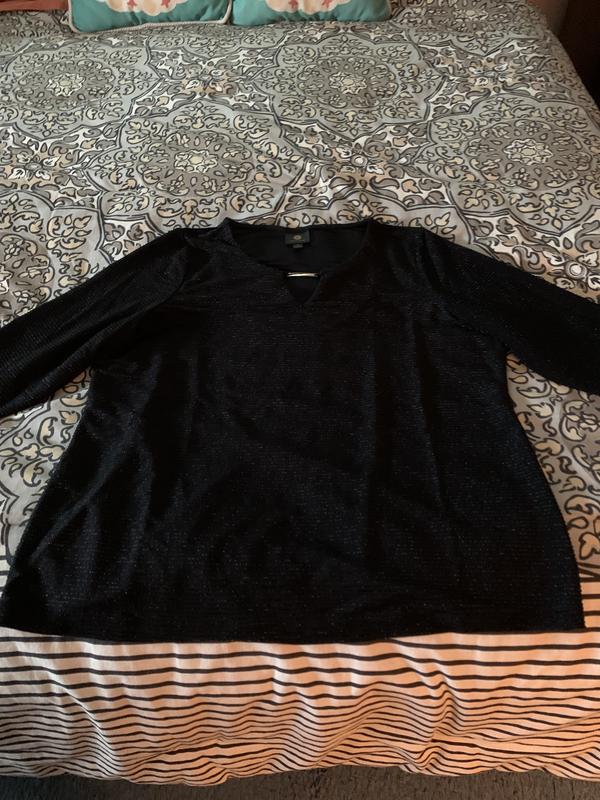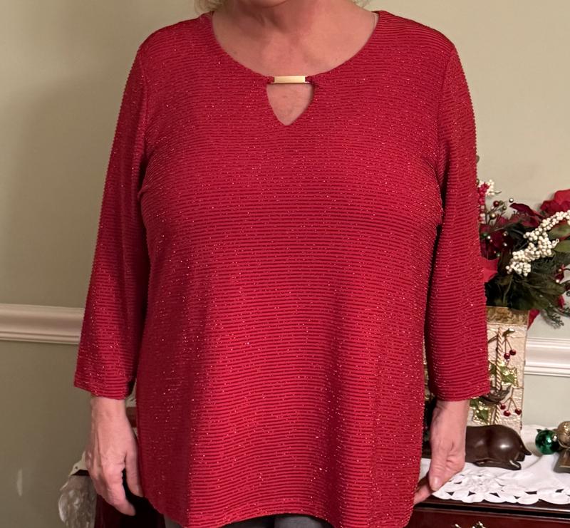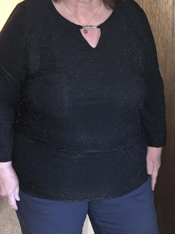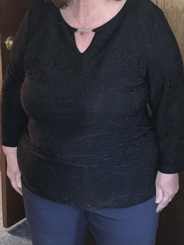 Very nice top made with a stretchy type fabric with silver threading throughout the fabric giving it a shimmery look. Top can be worn dressed up with a skirt of dress pants and heels or also with a nice pair of jeans with black blocked heel boots. Very nice top just in time for the holiday season. Top ran a bit wide across the chest area. Length was at the hips making it a comfortable length without riding up. Washed on delicate cycle and line dried. No wrinkles and no shrinkage. The neckline gives it a dressy look with the open v and gold bar. The three quarter sleeve length is also a great feature allowing you to wear a watch and/or bracelets without catching on the fabric.