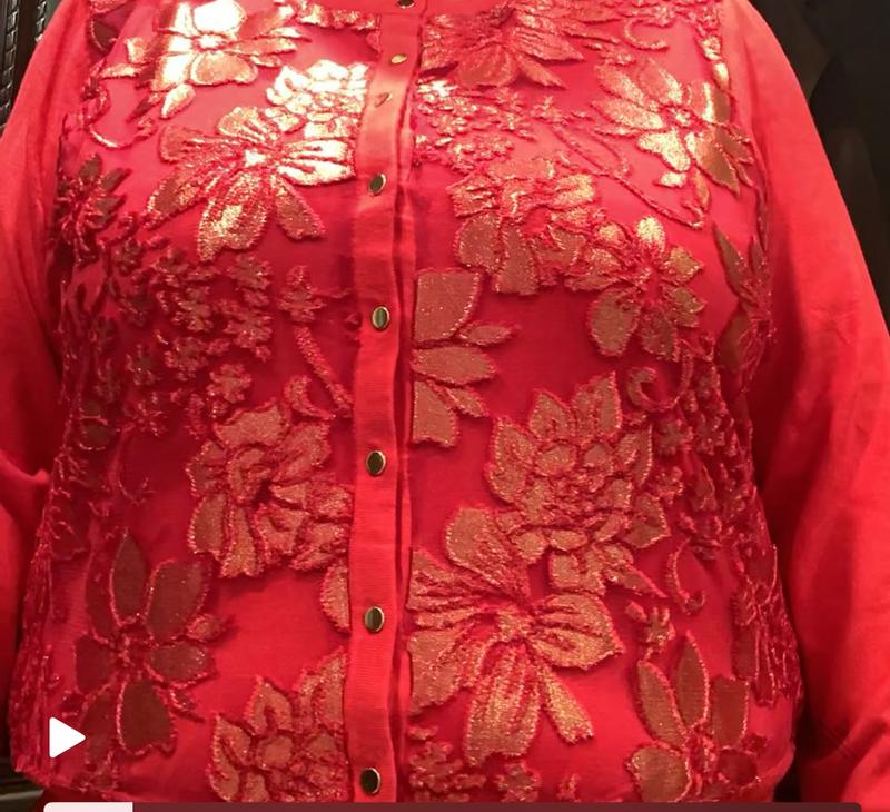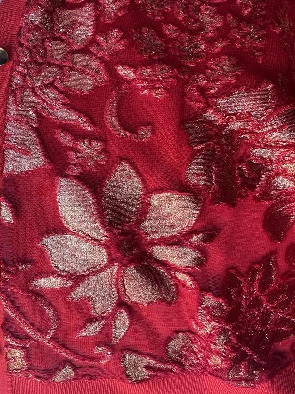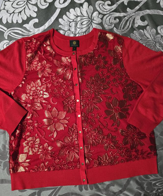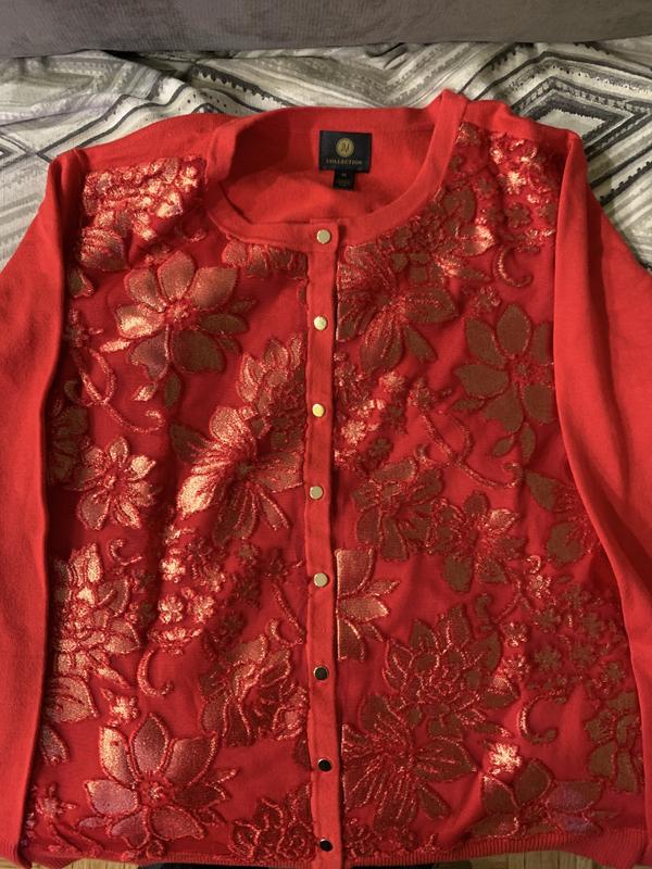 Very pretty and Christmas themed sweater. Very Red! It is beautiful but it does seem to run small so size up. Soft but light not too heavy. Goes well with both dress pants or jeans. Plan to wear it to my Christmas party!