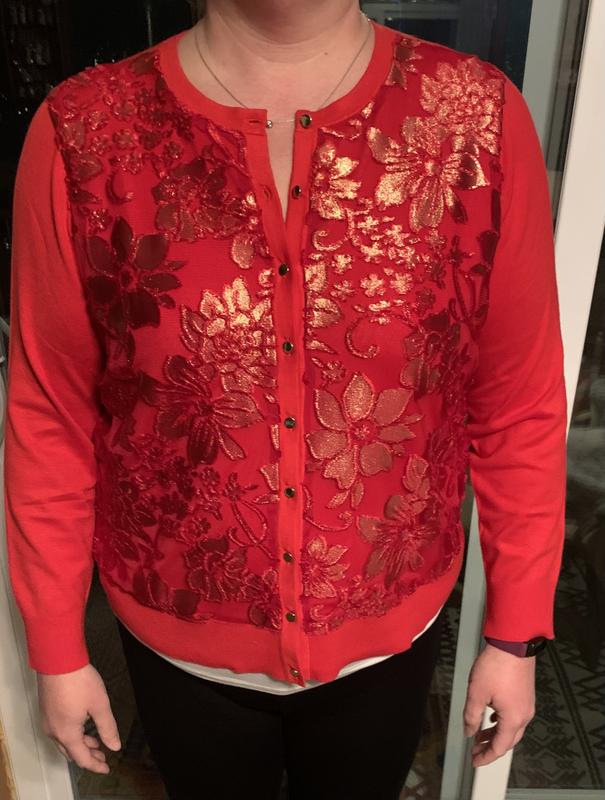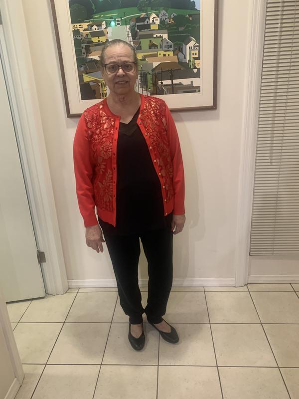 This is a beautifully designed sweater with appliqué floral design. I have it in red and it is perfect for holiday parties. It is dressy, comfortable, and lightweight. I wore it to church and received several compliments. It runs true to size and easy to launder.