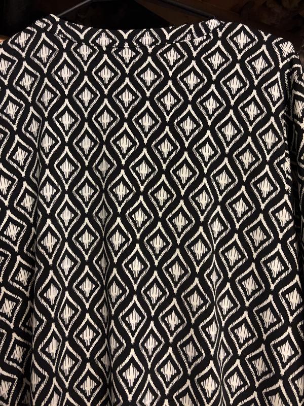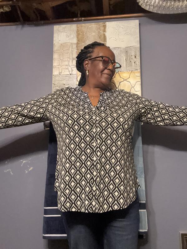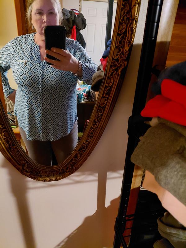 Very nice blouse, soft and light. I really like the length of the blouse, not too long and not too short. It is very light and a comfy loose fit. I didn’t feel too tight and it didn’t make me feel too hot. I liked the beautiful color, a light turquoise blue with diamond shape design, paired well with my black slacks for a more business attire, and went well with my jeans for a more casual spring look. I would definitely buy this again and hope to see other colors and designs.