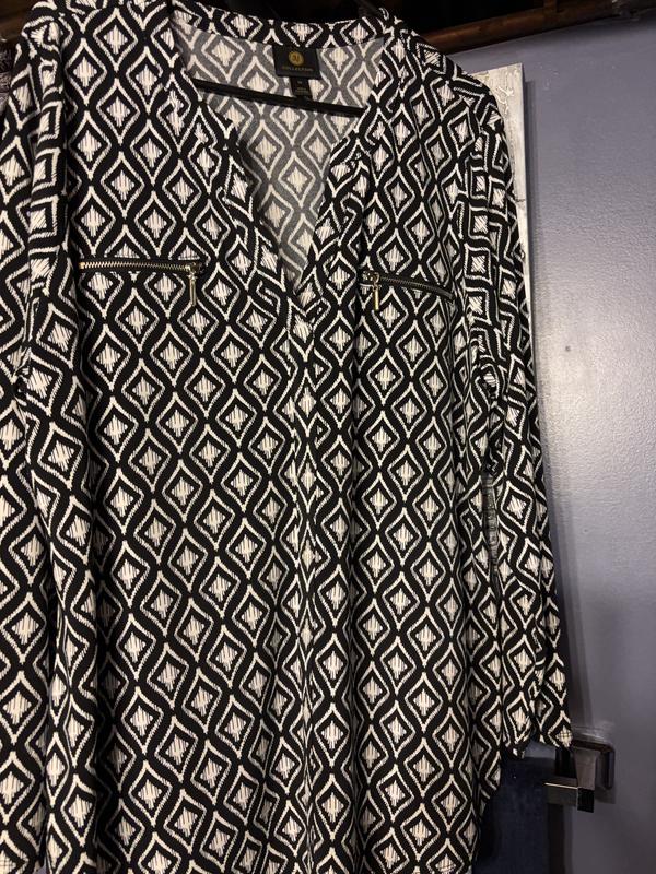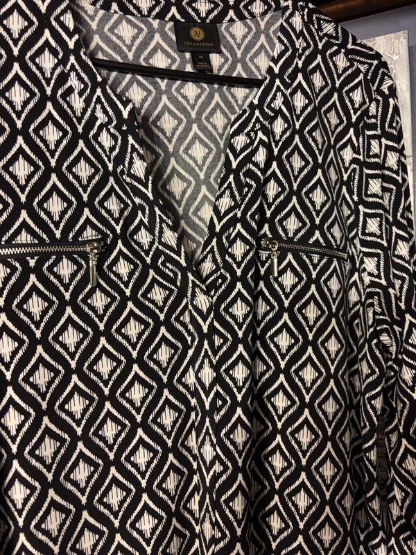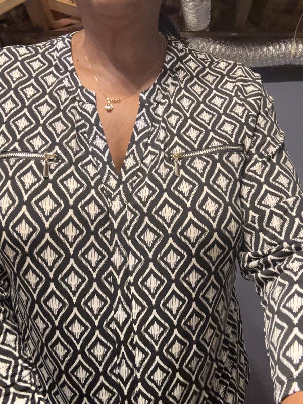 This is a light weight blouse with very cute zipper accents on the pockets. The print is sophisticated It is true to size and fits well. The fabric is not stretchy. Very cute it will get a lot of use.