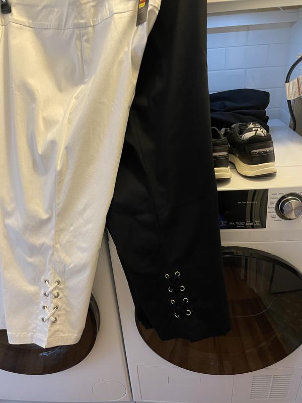 These lovely white crops offer a comfort waist with ties through grommet embellishment on the outer legs. Gives you that dressed up feel.