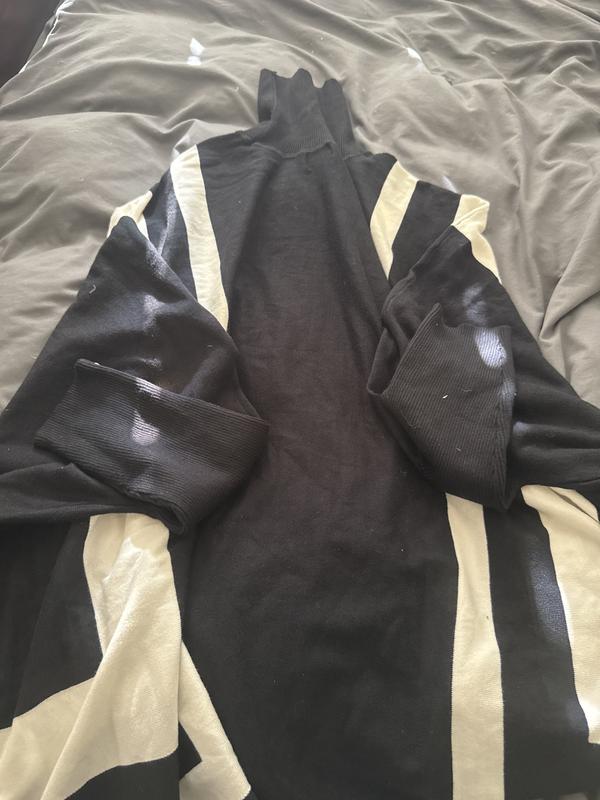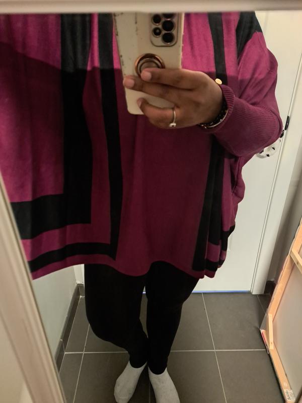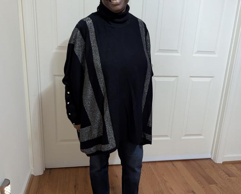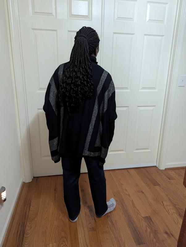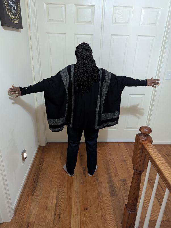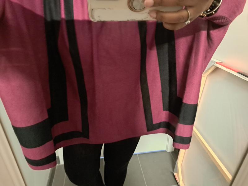 This sweater poncho is everything. Got this for my 80 plus year old mom and the first thing she said was “I love the feel of this!” Even though she put it on and didn’t realize there were sleeves as well 🙄 which is an added bonus, and also gives a nice structure to an otherwise blanket type of look. The color blocking gives it a fancy flair as well. She acted like she was part of a Motown singing group with this on! What a great bold addition to her wardrobe. You can spice up any outfit, or even cover up something not so nice and feel amazing.