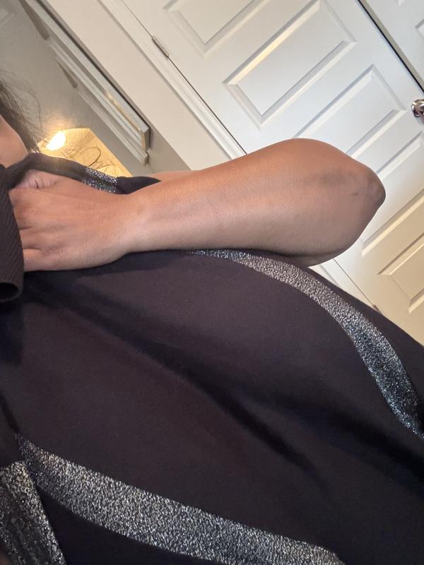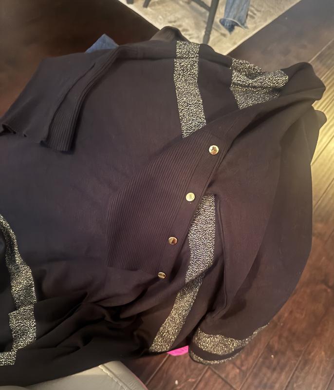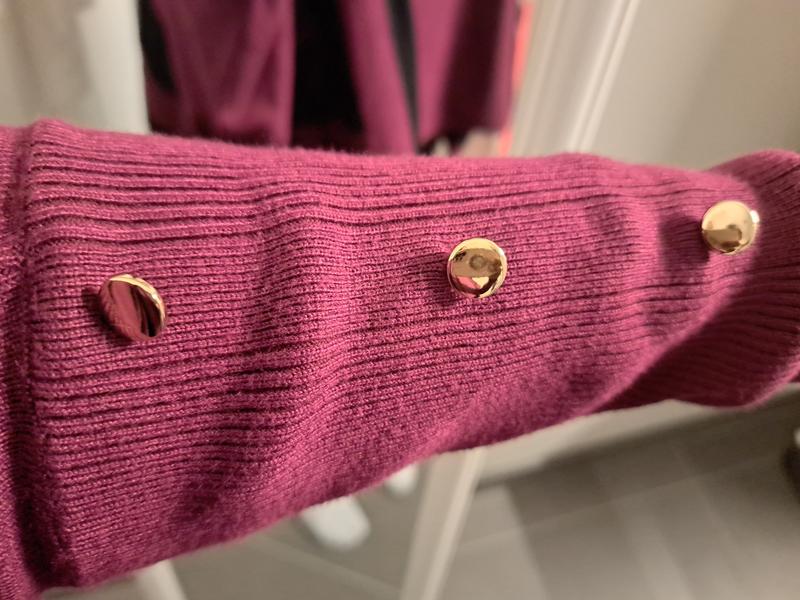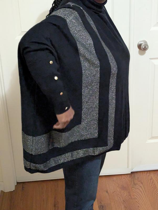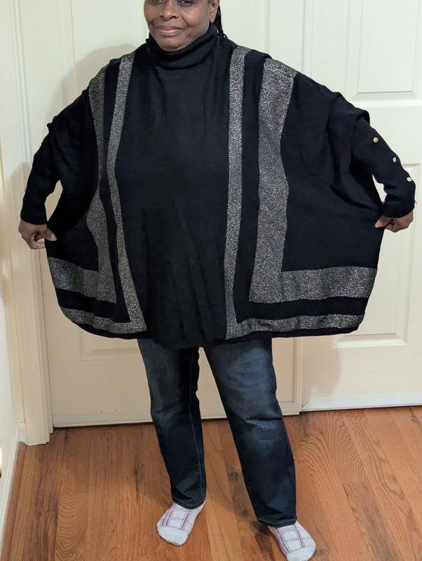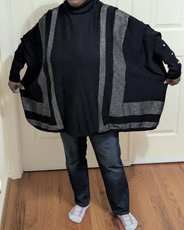This is a beautiful sweater. The gold threading lends itself to dressier holiday occasions but not to the point that I couldn’t also wear this to the office. It is not as long as I’m used to for poncho styles, but it is good for daily wear. The button detail are a nice touch.