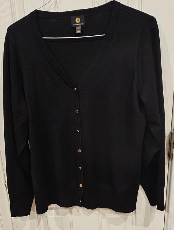 Love the sweater, the weight and body of this sweater but I hate the cheap gold buttons. They look cheap on the deep black sweater. It fits well and is the right length for my short height. I'm keeping the sweater and replacing the buttons.