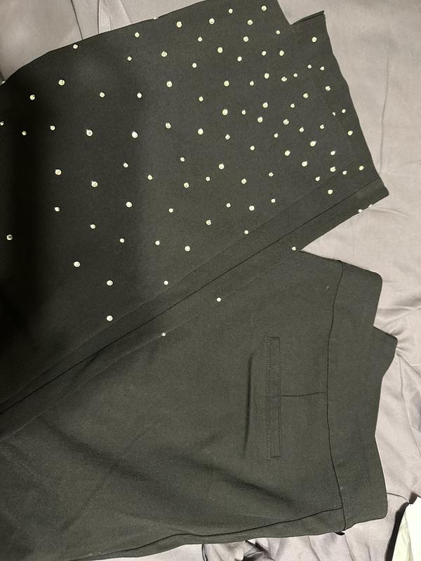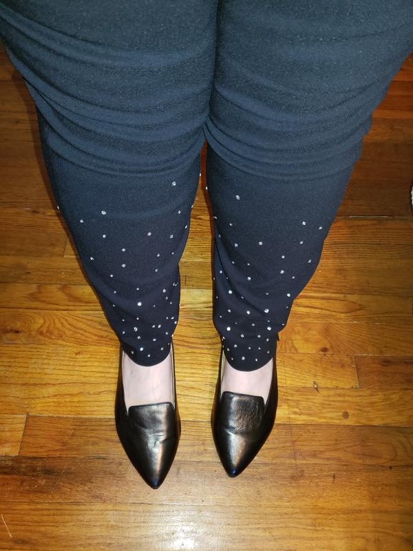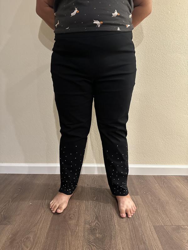 Great pants for the holidays! These stretchy pants are comfortable and fun. I love the rhinestone accents on the bottom. It adds some sparkle but is not over the top. I am looking forward to wearing to holiday parties with a cute sweater.