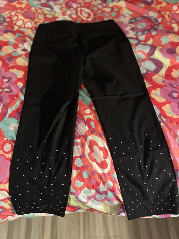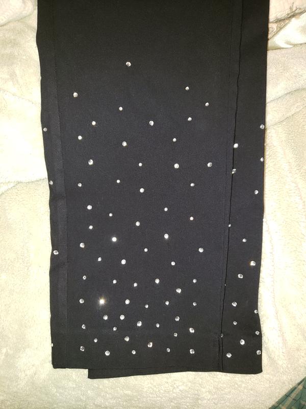 These pants exceeded my expectations! A sure fit. The sparkling gems on the bottom if these pants are a glamorous extra! A perfect trouser for the holidays that are approaching. Theres a slit @ the hem that is very nice when wearing with pumps! Again, exceeded my expectations!