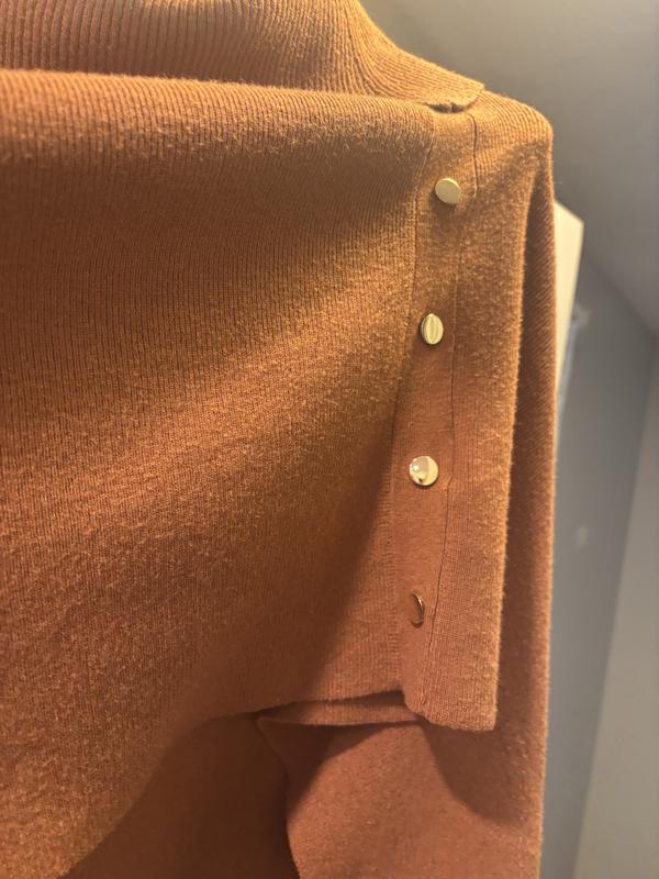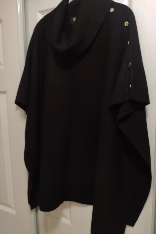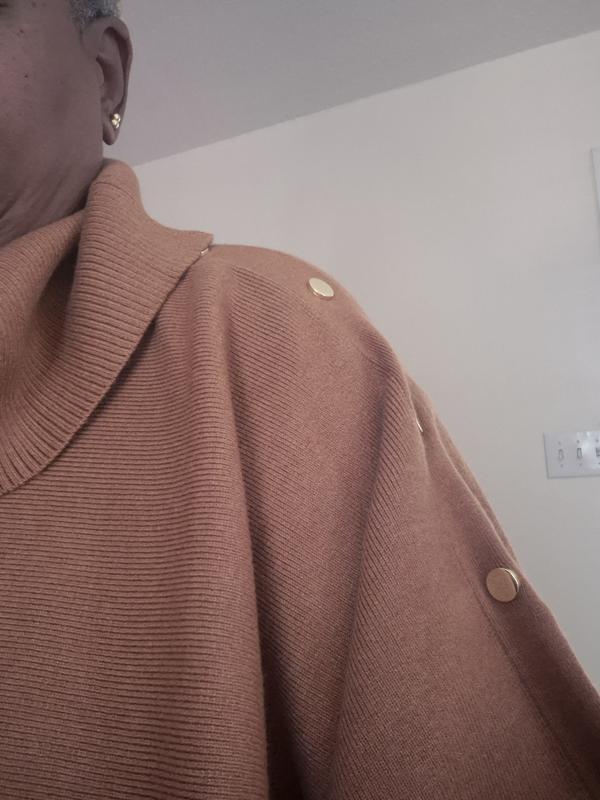 I received this beautiful, soft and cozy women's cowl neck poncho and immediately thought...WOW! This will become a staple in my wardrobe because it's so classic & elegant, but can wear casually or dress it up with a bulky necklace or scarf. It feels like cotton, but is a combination of polyester, nylon & viscose which will last a long time. I really like the accent gold buttons that go down one side of the poncho as they are subtle, but add to this stylish piece. The size is accurate as to what I normally wear. 5 Stars!