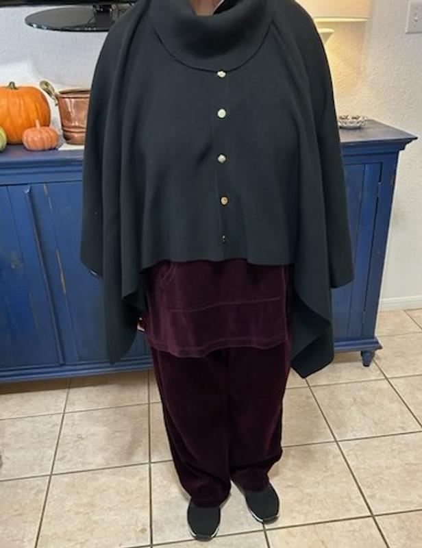 I just love this elegant-looking Poncho! Today, the temps dropped to low 40’s, this area in Texas. Perfect weather to finally enjoy it. The Poncho is designed to wear buttons to the left side, but thought I’d try wearing to the front, instead. Either way. It’s very comfortable, warm, cozy-feeling. Medium Weight. Large size runs true to fit. Can dress up, or wear casually with Jeans. I’m going to order a few, as Christmas Gifts. No doubt, they will be great gifts.