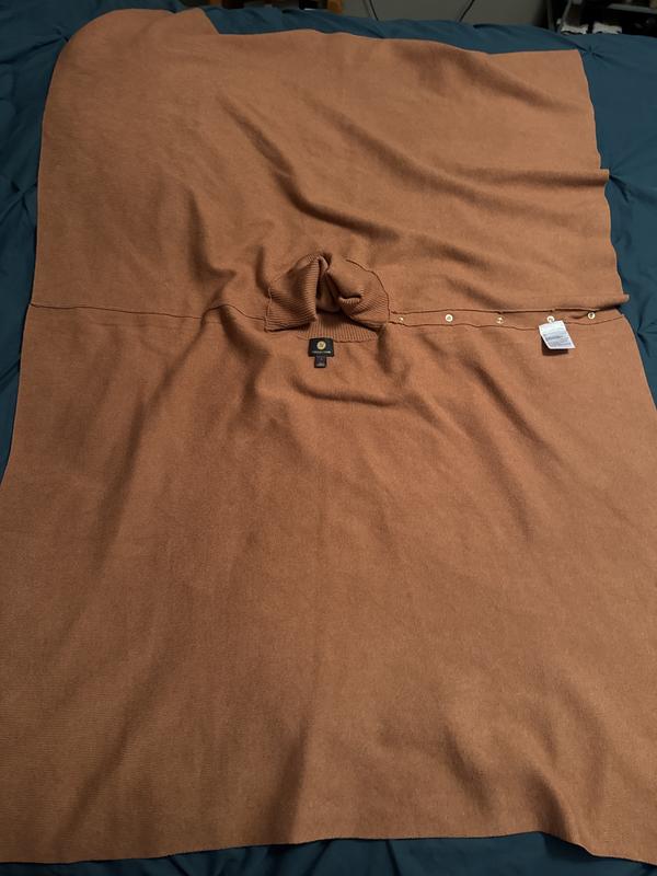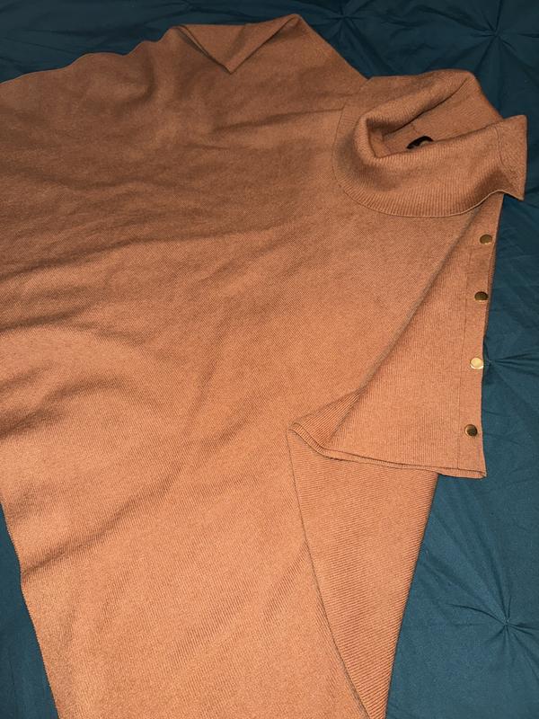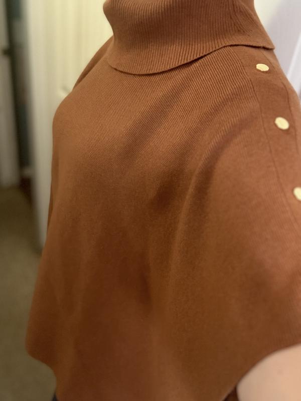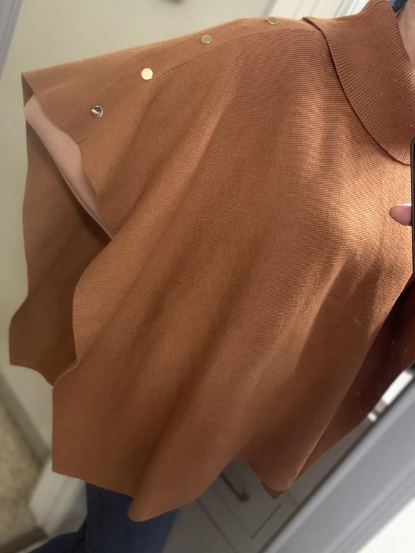 It’s also versatile as it can be dressed up or just casual depending what you wear with it. Perfect for travel and transition into fall season. The gold tone accent “buttons”along with the cow-neck makes it easy to put on and off.