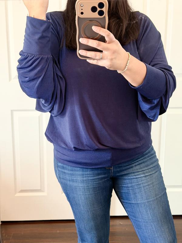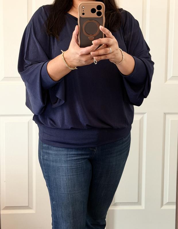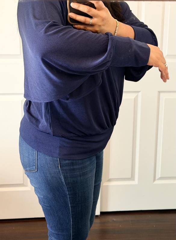 Nice top in a true navy blue. It has just enough room and a flattering fall that nicely covers the belly area — definitely a plus! The material didn’t impress me at first, but once I tried it on, I really liked it. It’s not see-through, and because it has a bit of weight to it, it drapes beautifully. The slits on the arms are there, but you can hardly notice them. The openings are long yet very discreet — nothing shows, and the sleeves stay perfectly in place without flapping around. Overall, a very nice piece!