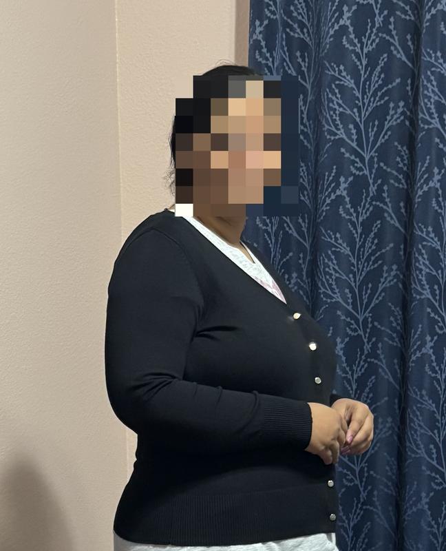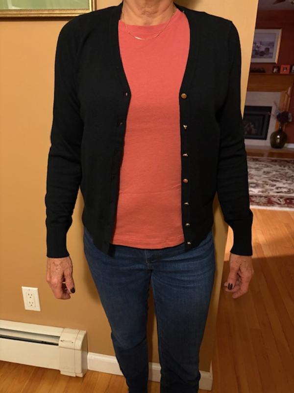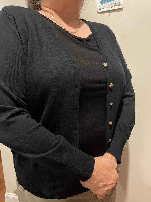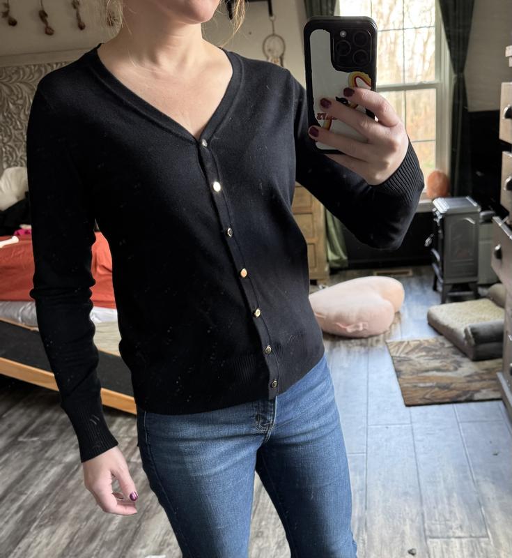 I got this cardigan in black with gold tone buttons. It is super soft fabric with enough room to wear a tank underneath or to be buttoned up and worn without anything under it. The V neck is perfect, not super low. Sleeve length is great, hits right at my wrist without having to turn it up.