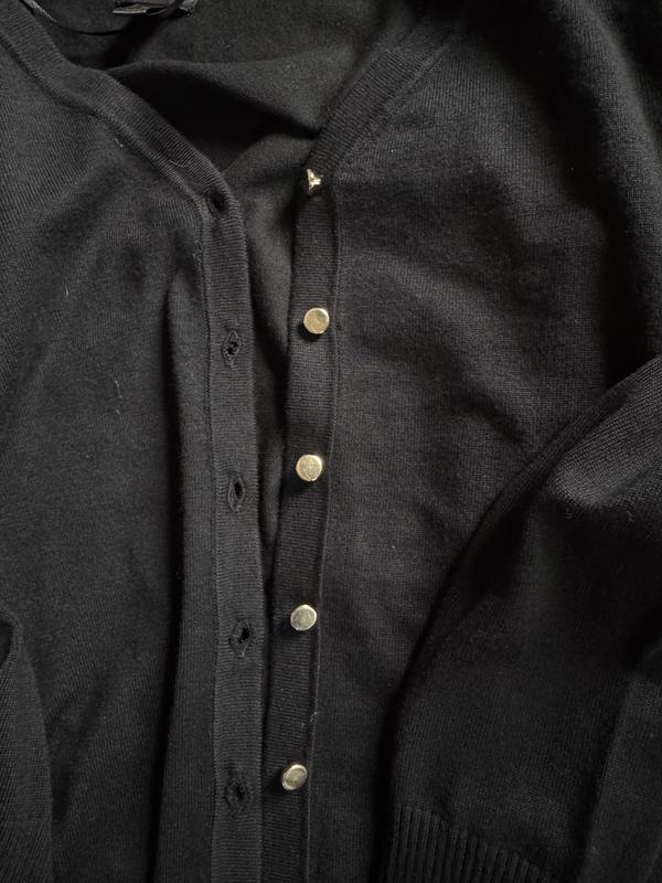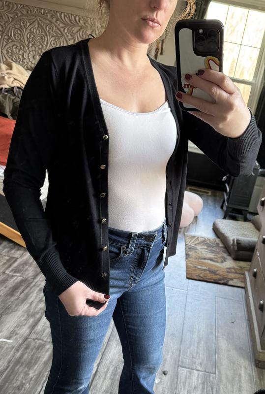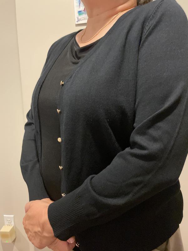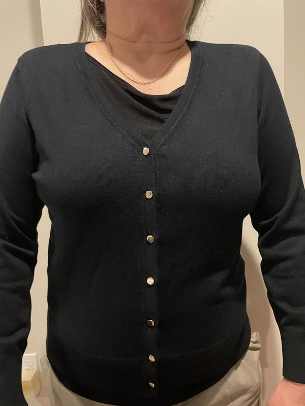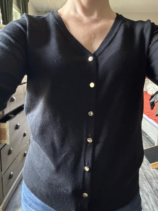 This is a lovely V-neck sweater. I got it in black and it goes with everything. I can wear it on its own buttoned up or with a Cami underneath I wear it to work the other day and got a lot of compliments. I also like that it’s not cropped.
