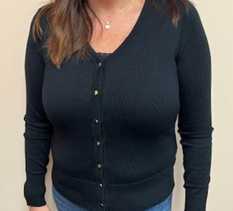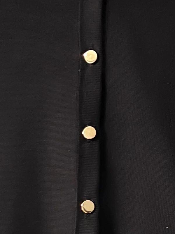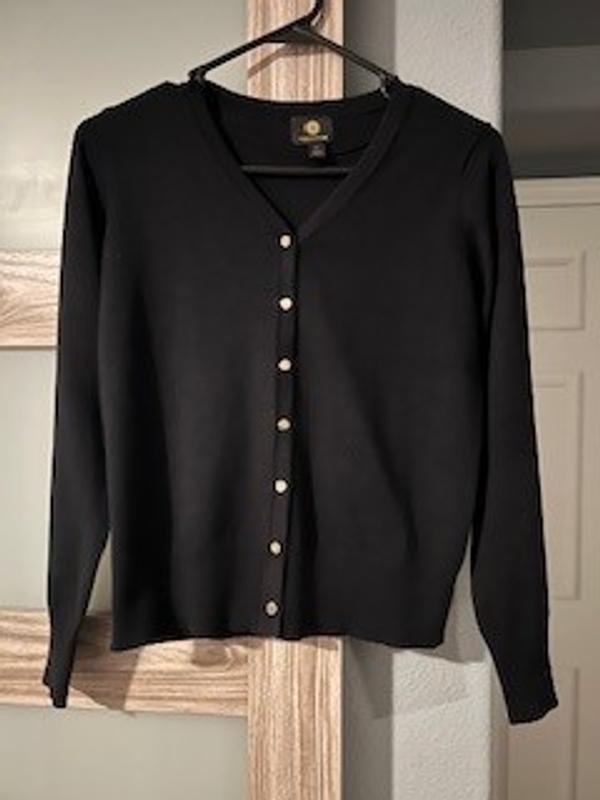 Classy, traditional black button up sweater. Can be dressed down with jeans or dressed up. The fabric is very soft to the touch and the gold buttons elevates the look. The sizing is true to size. Would highly recommend adding as a staple to a wardrobe.