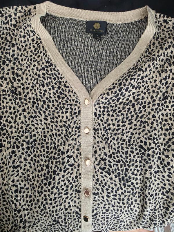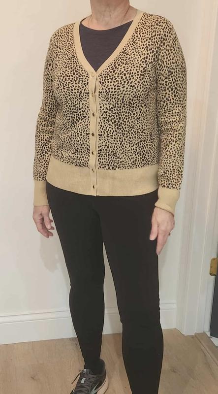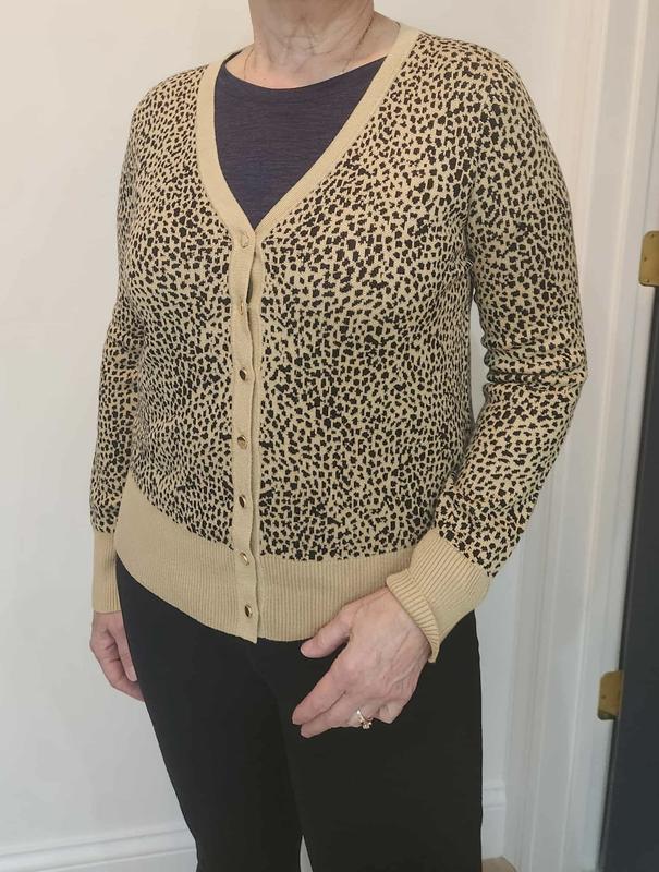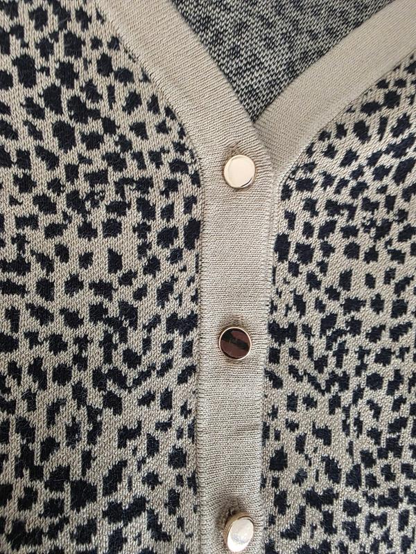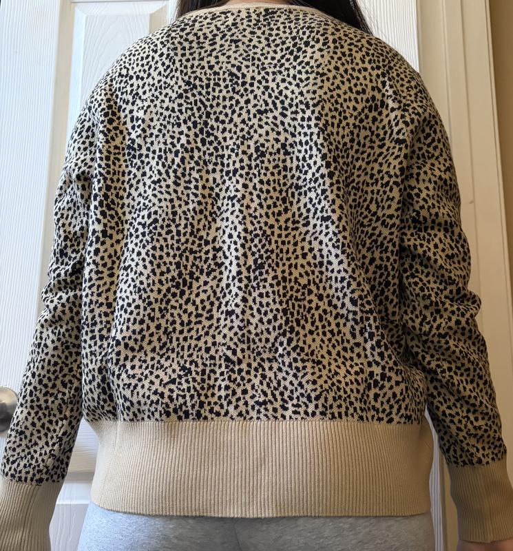 This sweater is very soft, stylish and versatile. It could be dressed up or worn with jeans. Love the gold buttons and leopard print. V neck perfectly sized and not too low to wear alone. Length can be worn with any type of pants.