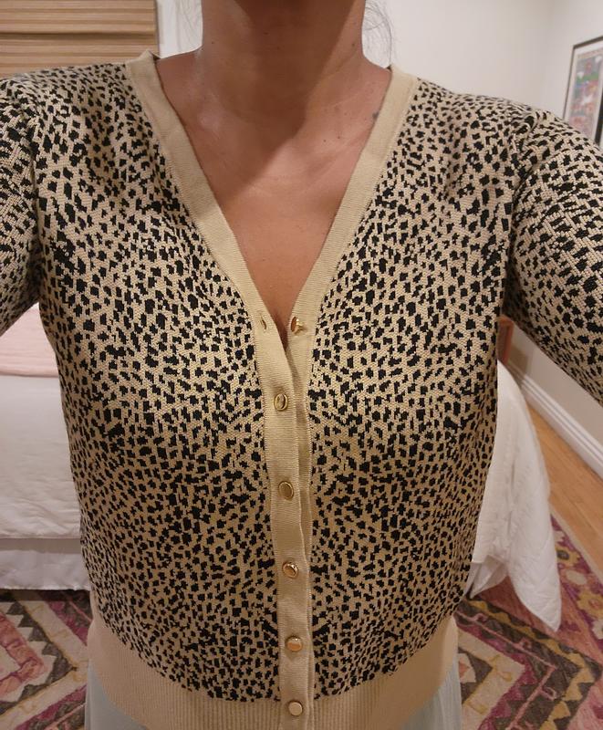 I really like the little gold buttons and small animal print of this cardigan. It’s not too loud. It can be dressed up or down. It runs true to size. It’s more of a fitted style so if you want it roomy, go up a size.