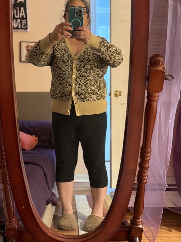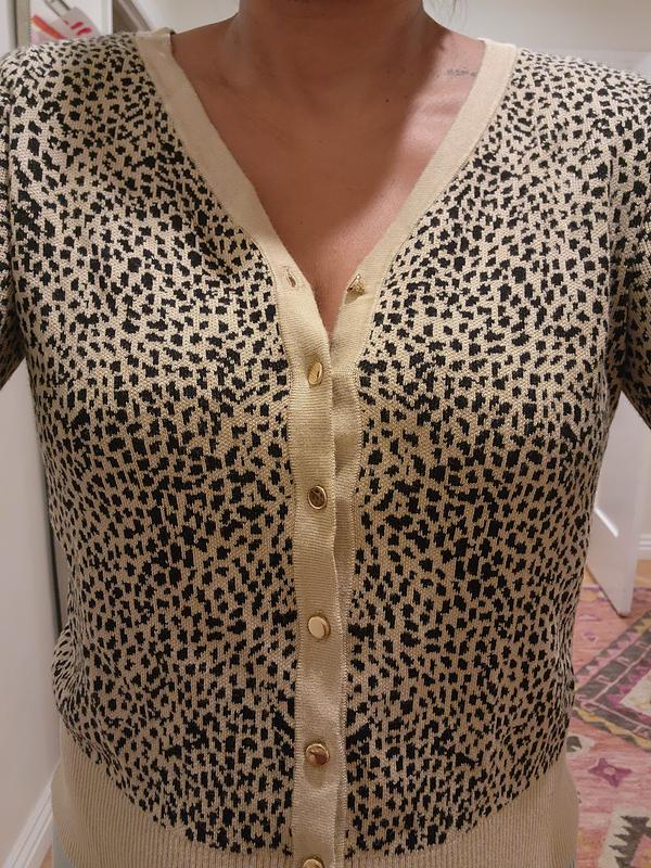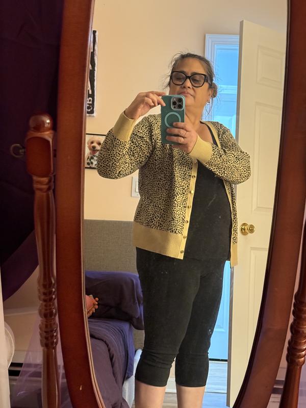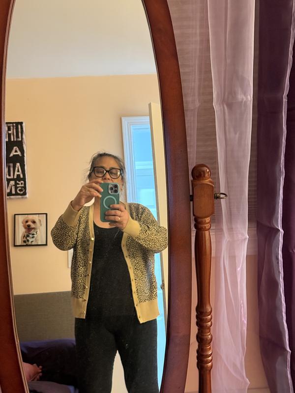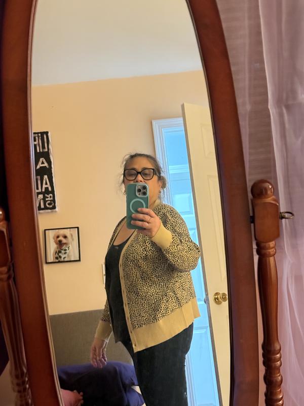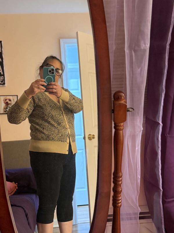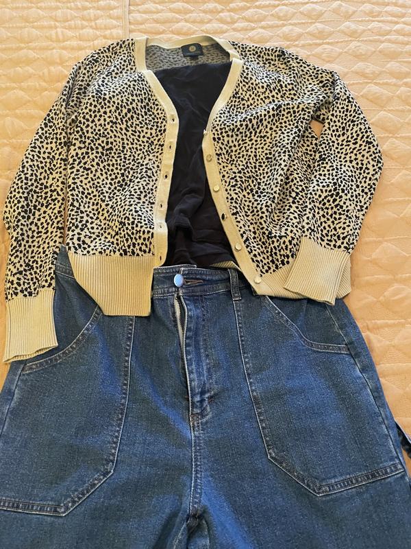 I am very happy with this updated version of a cardigan sweater. The leopard design looks great with black jeans or black dress pants. It is a nice option from wearing lots of tunic sweaters. The fit was perfect.