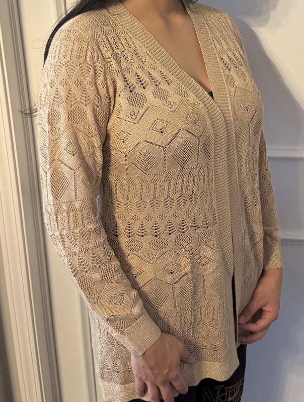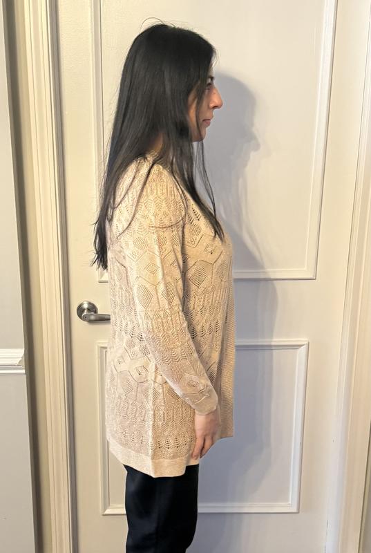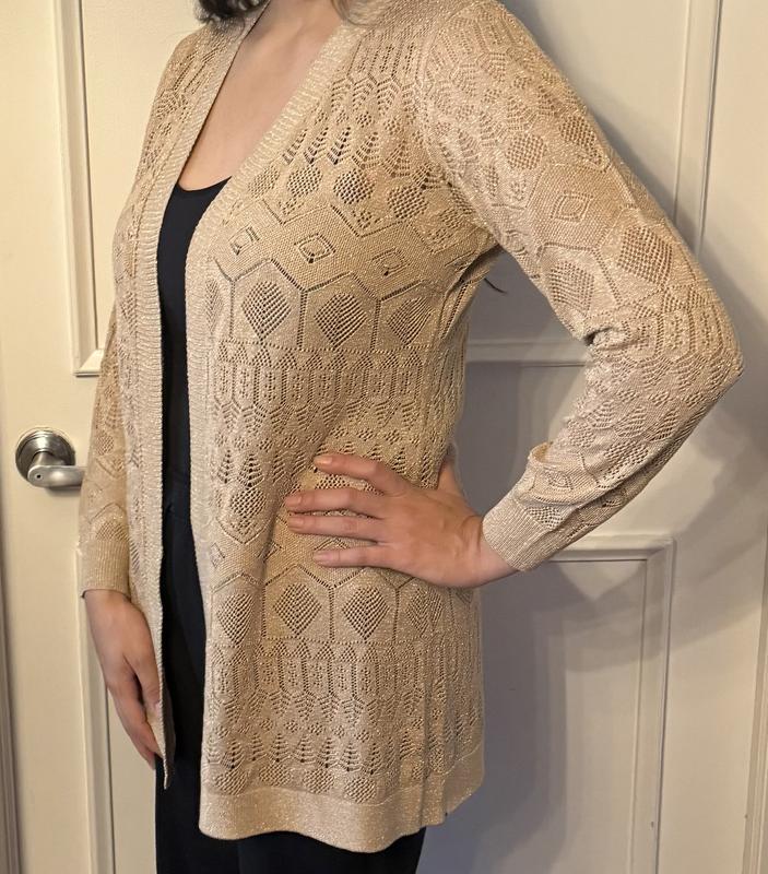 Very pretty and dressy sweater. The gold color really adds to it. I’m going on a cruise this spring and this sweater will definitely be going with me. Prefect for those breezy nights and chilly air conditioned inside rooms. It’s a little long for me but I will still pack it and wear it.