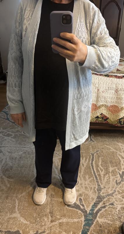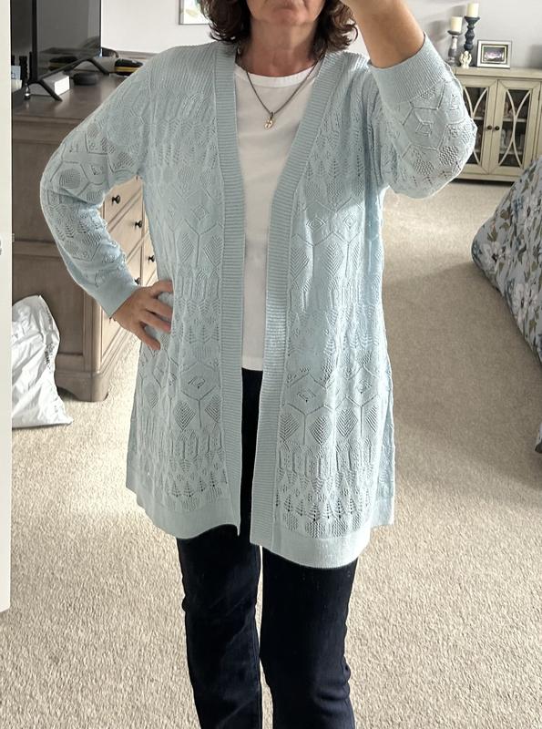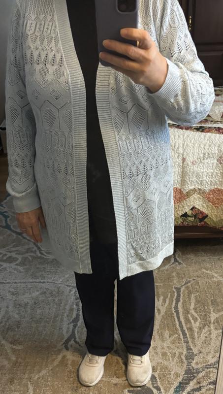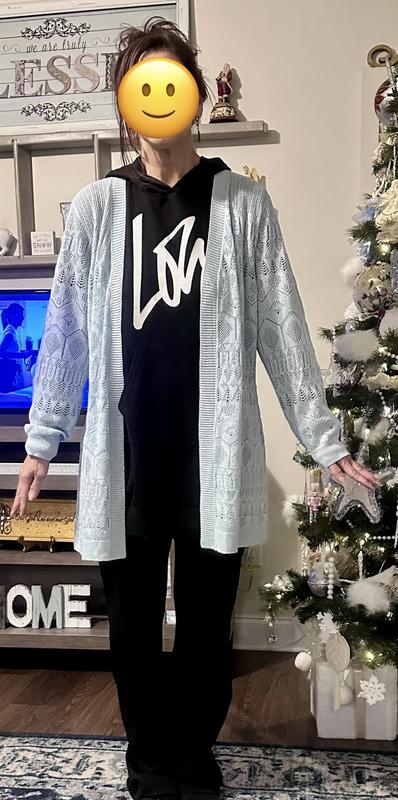 I haven’t worn this out yet; it’s winter, and it feels a little too light right now. The color is a beautiful silvery gray with sparkles sewn into the material. The length is great. I’m five foot nine, and this is long enough to cover my butt, which is very important. Texture-wise, it’s a little scratchy on bare arms. The design looks intricate, with tiny holes that make a repeated, detailed pattern. The sweater is pretty, but the style seems a little dated. My grandmother would probably love this.