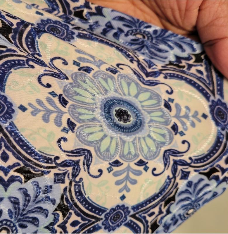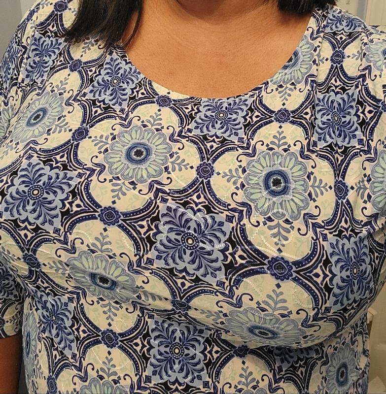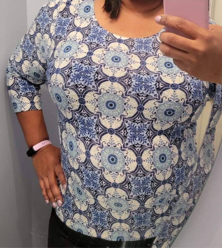 This is the newest in a growing collection of these jacquard tops. I love the fit and the comfort of them. The 3/4 sleeve hits exactly where I like. They are easy to wash and wear. Hopefully Macy’s continues carrying them, I’d like one in purple.