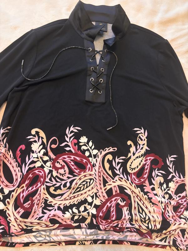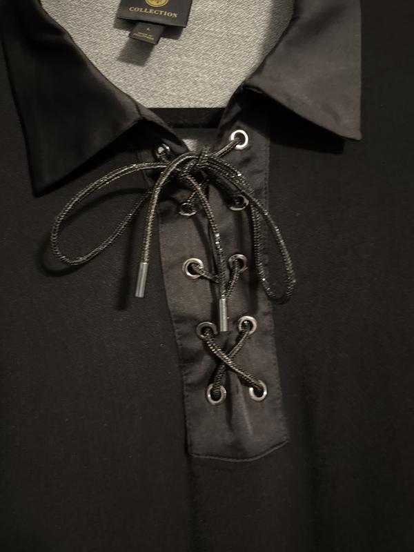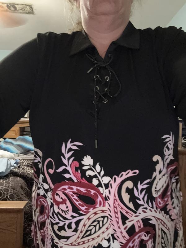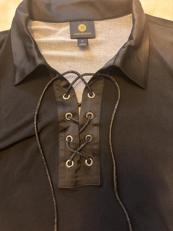 The shirt was well made. At first when opened package I didnt think I would like the material but once I tried on and wore shirt it was very soft and flattering. I received alot of compliments. The only issue or dislike I had with short was the string tie around the neck. It Wasnt my taste and I would have preferred solid black string as I feot it was to shiney and stiff. But all in all I felt it was still very nice shirt, dressy enough to wear to work but not too dressy that I could wear out to dinner with pair of jeans. Fit was true to size I wear a large and it fit me perfect.