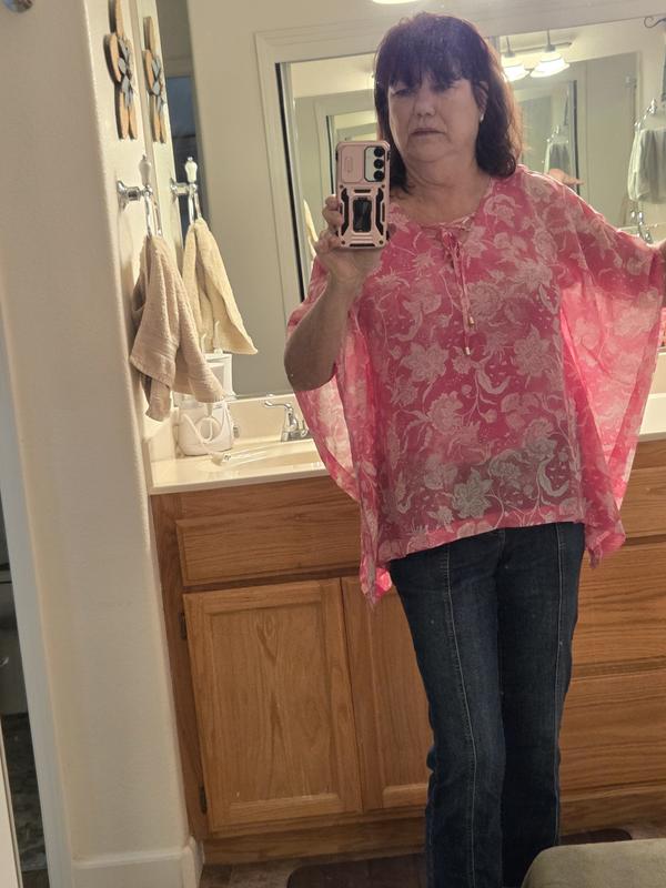 This top looks beautiful and fits perfectly. Loose yet complimenting! You can dress it up or go casual.