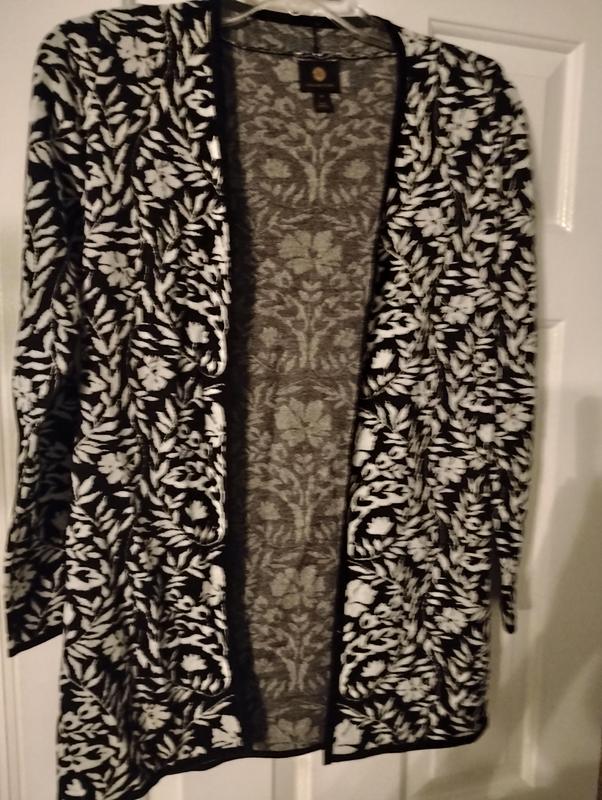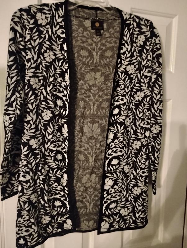 This is a casual open sweater jacket which falls to mid thigh length The black and white all over swirl pattern limits wear to pairing with solid colors or very small and subtle prints. The fabric weight is medium and lends itself to three season wear.