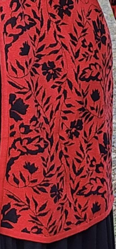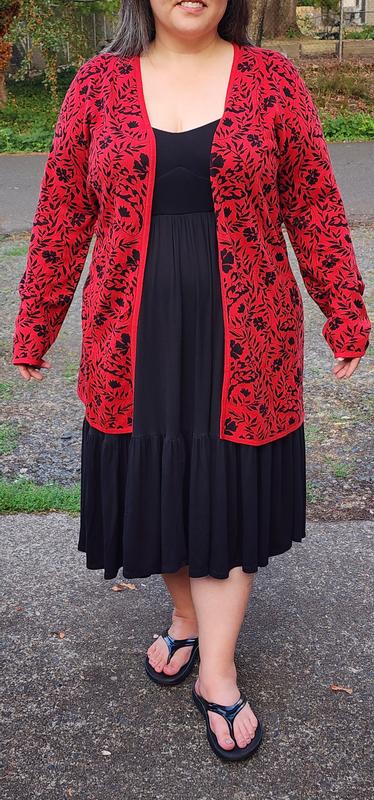 Really like this cardigan. Not too heavy but warm enough for cooler weather. Not bulky. Nice color and print. I normally have problems with long sleeves being too long, but these sleeves are just the right length. It washes up well and the material isn't scratchy to me. I also really like the longer length.