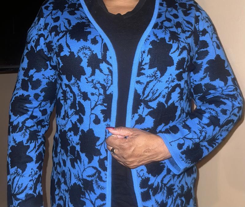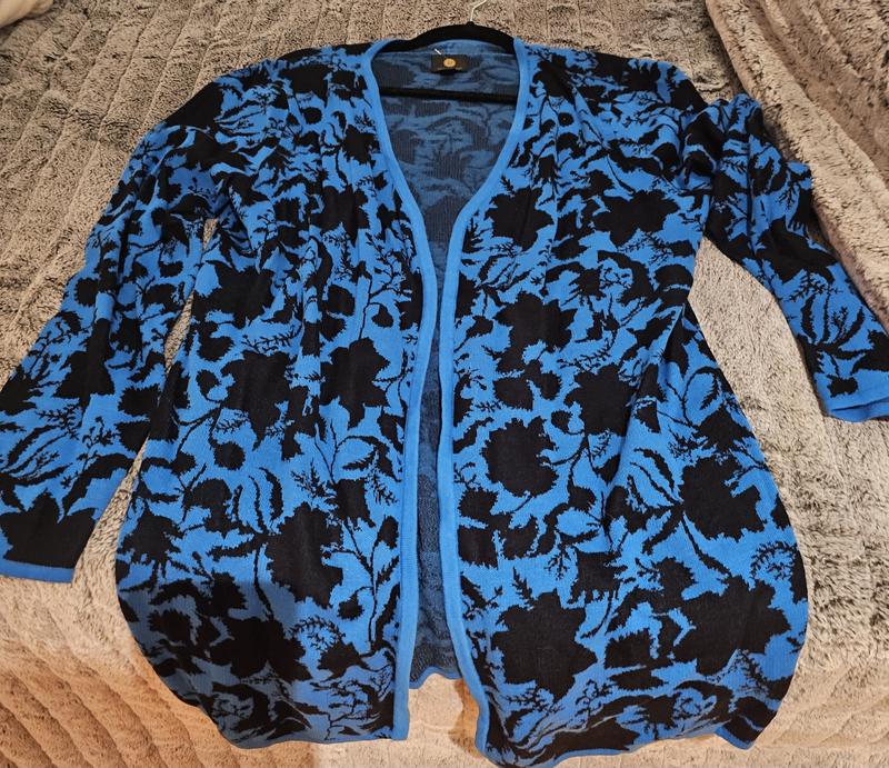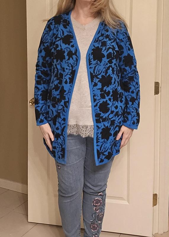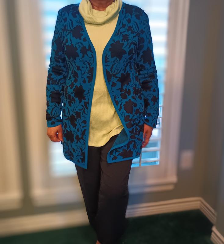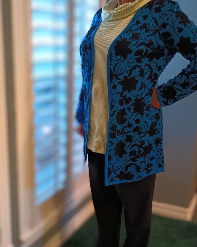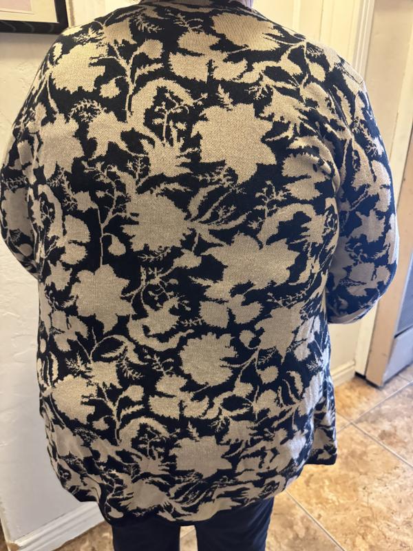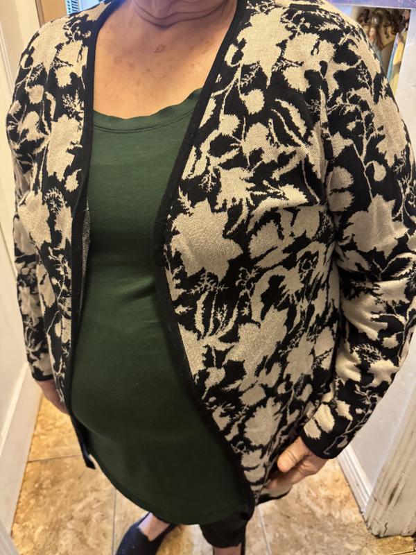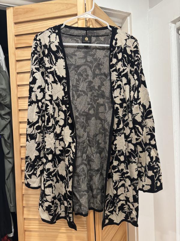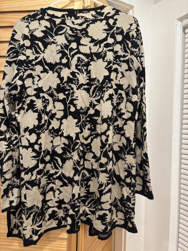 I received this product for an honest review. A beautiful cardigan with much rich black color and beige/tan flower pattern. I’m 5’5” and hits mid thigh. Roomy and flowy, and can be dressed up with trousers of with jeans, leggings. Material is very soft, almost cashmere feeling. Great for fall/spring days. Overall a beautiful lightweight cardigan is a staple to have.
