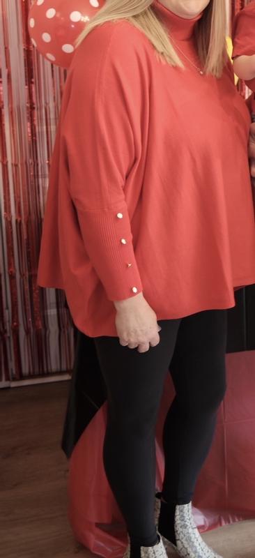 Great sweater very flattering if you carry extra weight in your upper arms and tummy. I have collected 5 over the years. It they wash well. I wish they’d bring back the red.