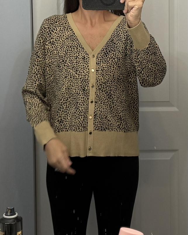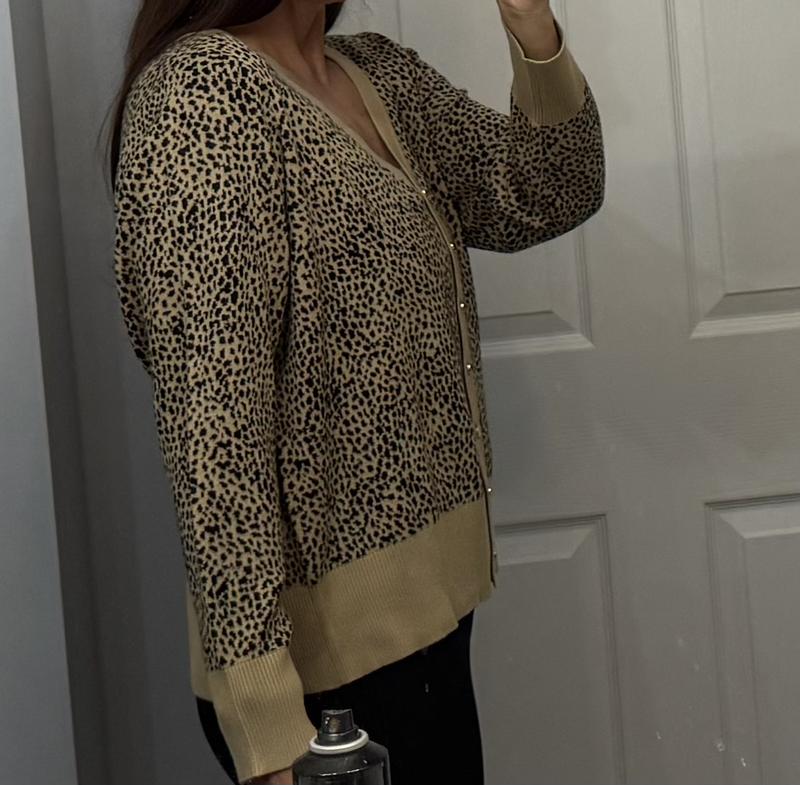 This is a cute and comfortable sweater! I wore this to work with black pants, but this can also be dressed down with jeans! I typically am a medium, but wanted to leave it buttoned and have some extra room. I will be buying this sweater in all the colors and prints available!