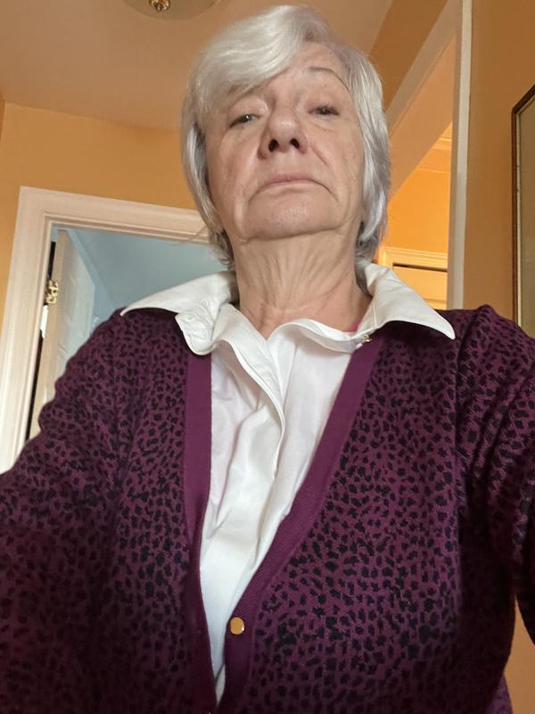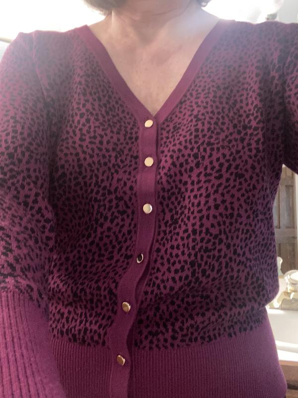 I am impressed with the quality of this sweater. It has a classic feel with the gold buttons and banded bottom while still being flattering for multiple body types. I am 5’8” tall and weigh 150 pounds and the Medium is a good fit including the sleeve length. The deep purple and black print has a blue undertone and looks fantastic with either a black skirt or pants. The sweater can be worn by itself or with a tee or even a turtleneck underneath. It is warm without being bulky and has a very soft texture. Animal prints are still in vogue and this sweater is a unique and well made wardrobe staple.