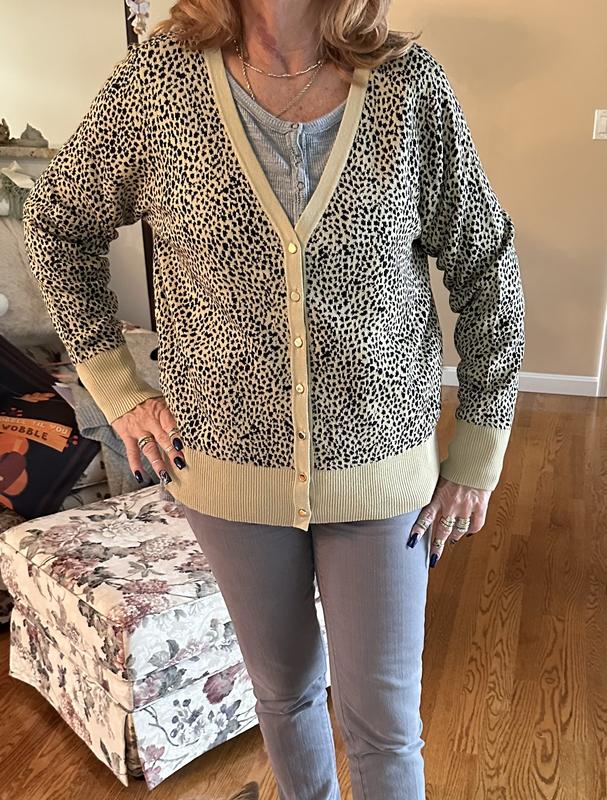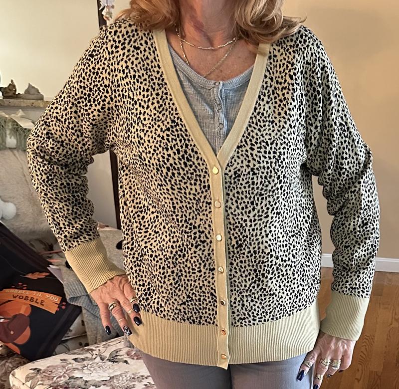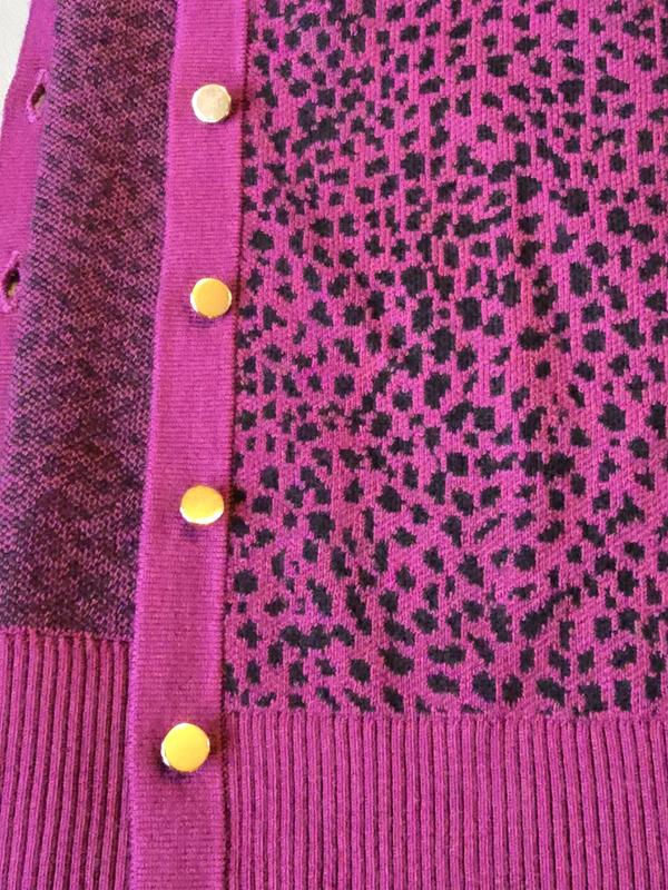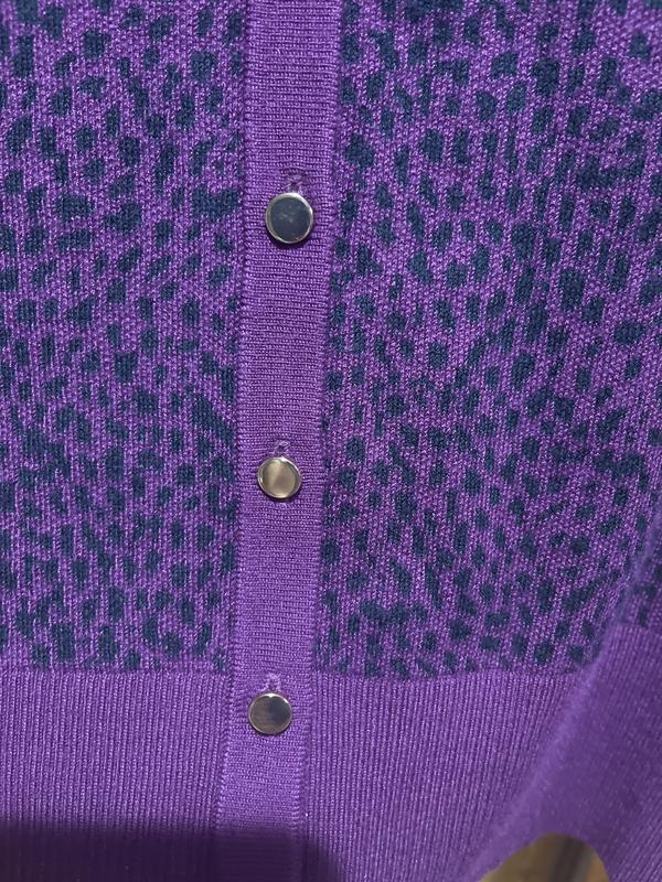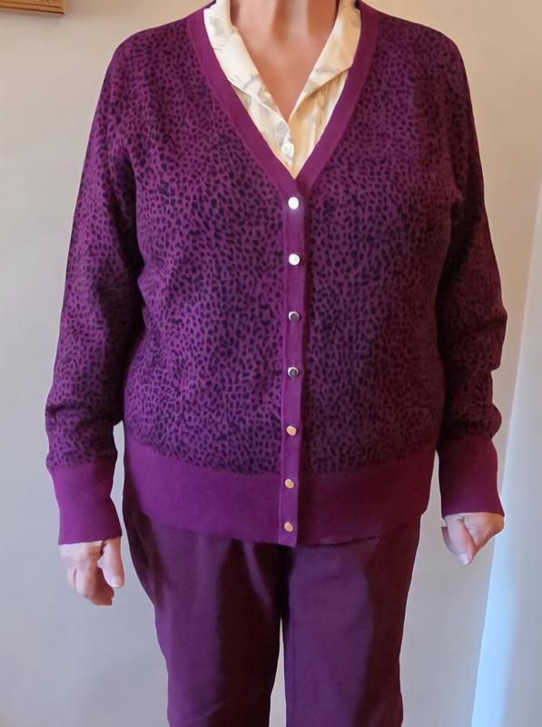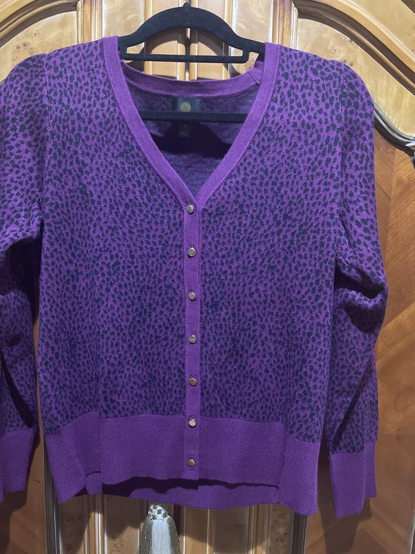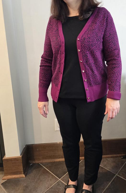 I am impressed with the quality of this sweater. It has a classic feel with the gold buttons and banded bottom while still being flattering for multiple body types. I am 5’8” tall and weigh 150 pounds and the Medium is a good fit including the sleeve length. The deep purple and black print has a blue undertone and looks fantastic with either a black skirt or pants. The sweater can be worn by itself or with a tee or even a turtleneck underneath. It is warm without being bulky and has a very soft texture. Animal prints are still in vogue and this sweater is a unique and well made wardrobe staple.