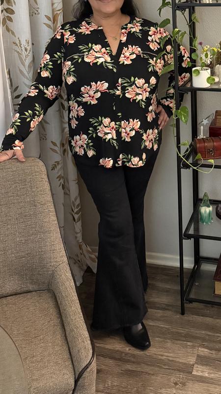 A cute blouse for work or play. You can dress it up or down. It has a very nice cut that is flattering to my shape. I like the front pocket detailing. It is a good length to either tuck in or leave out. It is soft and fits true to size. I am wearing an extra small. I found the color and pattern complimentary for my hair and skin tone. I really like this blouse.