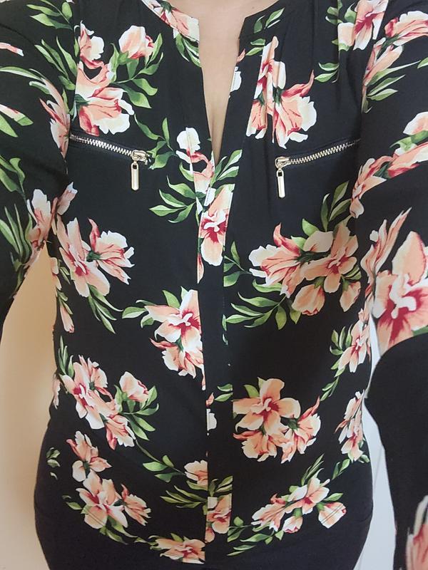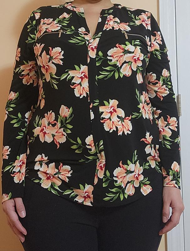 I received a JM collection floral top and i love it. It runs a little big, but is very comfortable. The material is polyester stretchy. It's V neck in the front and has two small pockets with zippers.
