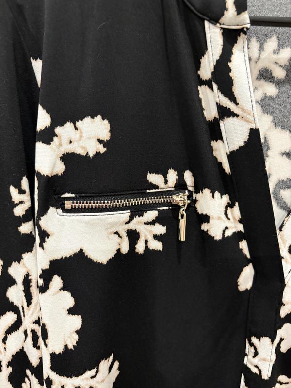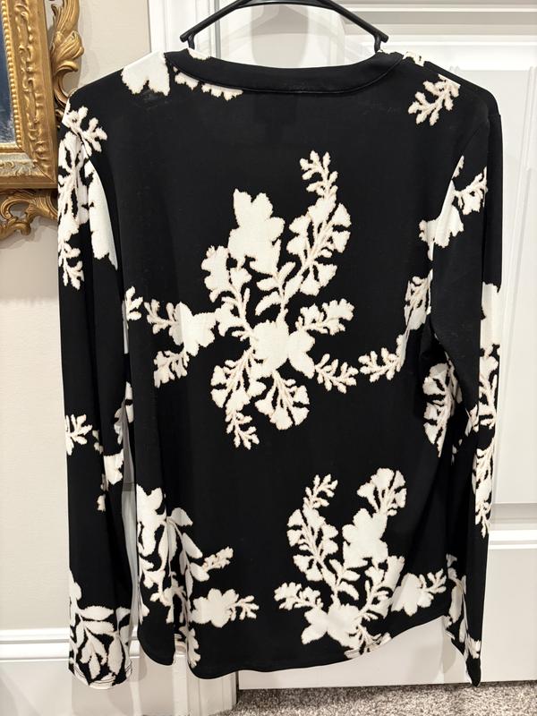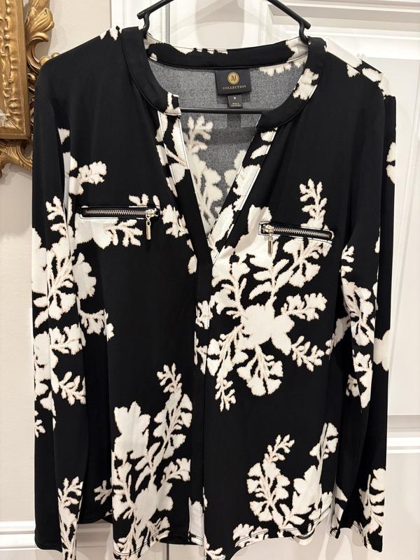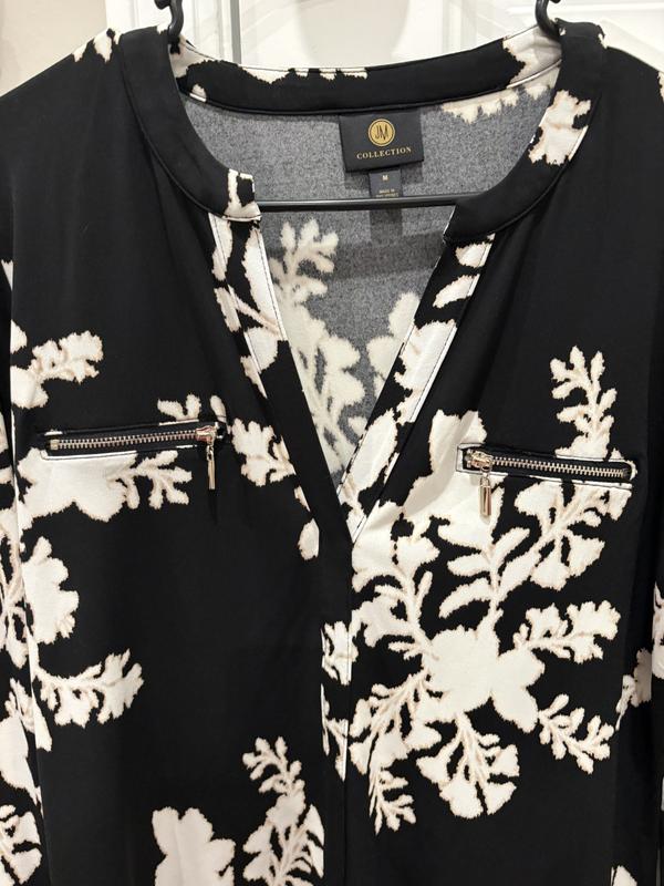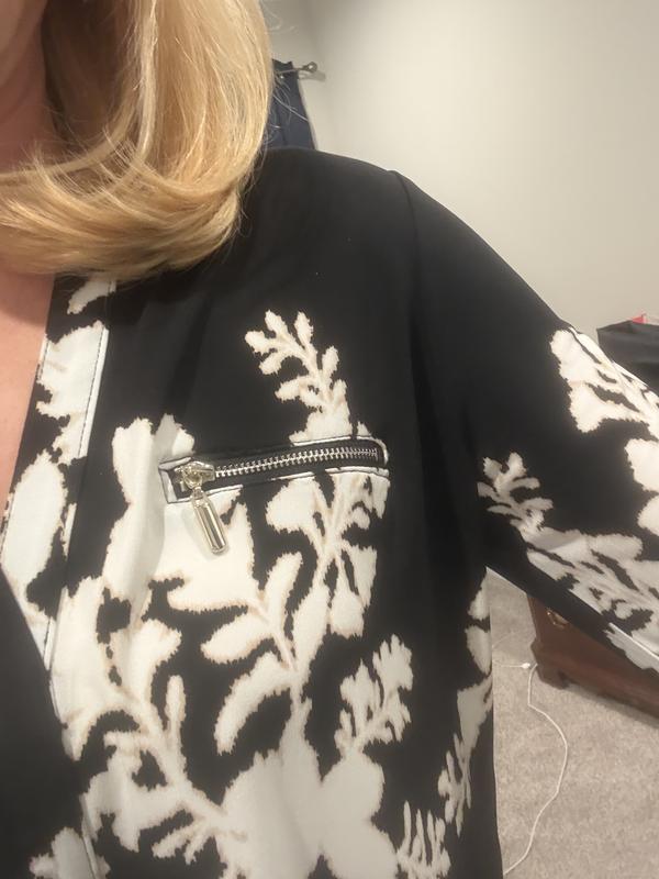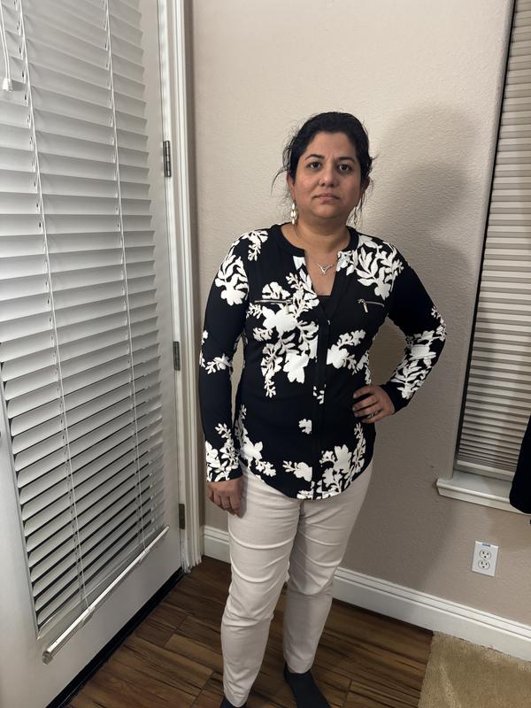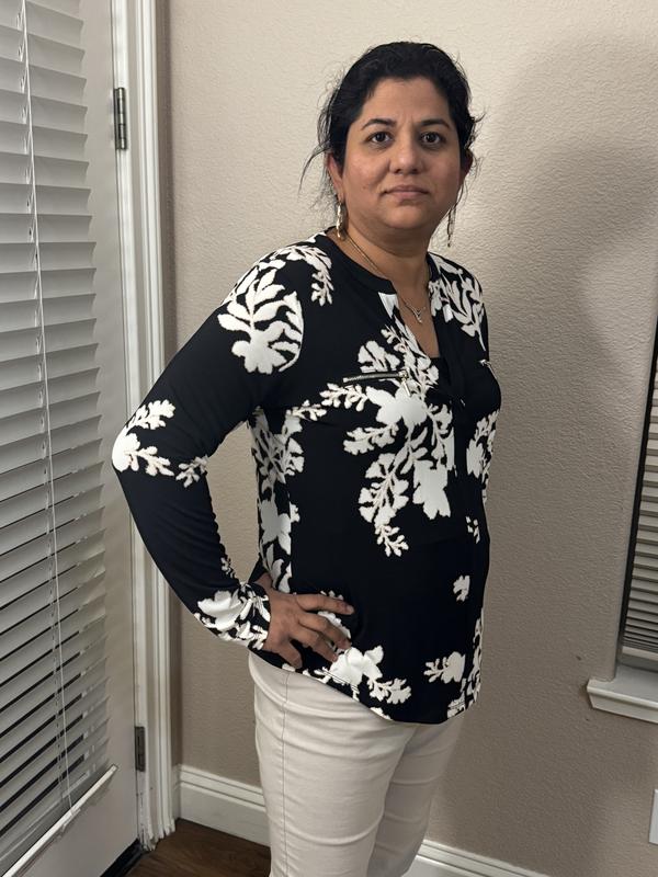 Perfect work top. Business casual that is dressy and comfortable! Lightweight fabric that is breathable. Longer length almost tunic style. Love the pattern and zipper detail. Also love that it can be styled with many colors so it is versatile. Perfect addition to a modest business casual work wardrobe.