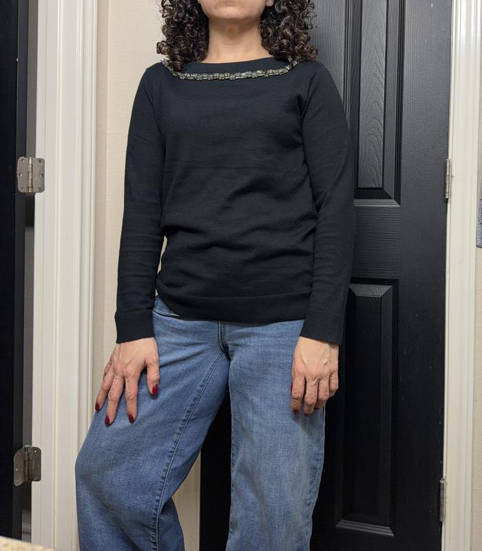 I was pleasantly surprised by this sweater. It’s one of those pieces that seems simple, but once I put it on, it just makes me feel put together without having to try too hard. The black color makes it so easy to match with almost anything I already have, which I really appreciate because it makes getting dressed fast and stress-free. I can wear it with jeans for a casual day, or pair it with something dressier if I want to look a little more dressy. What I love the most is the neckline. The small beaded detail makes it feel special without being too much. It’s not flashy, but it’s enough to make it stand out from a regular black sweater. I like pieces like this because they make an outfit be more styled without needing a lot of jewelry or extras. The fit is really comfortable too. It’s not tight, but it’s also not oversized, so it still looks flattering. I can move easily and wear it all day without feeling uncomfortable. Material feels really soft and even after a few washes it has retained its quality and the stones. I feel like this is a great piece for different seasons. I can wear it by itself when it’s mildly cold outside, or layer it with a jacket or coat when it’s colder.