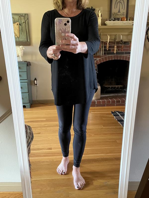 I bought this top thinking I could wear it with leggings. The fabric is thin and requires a tee or cami underneath. It poufs at the bottom, looking like a maternity shirt. I returned it.