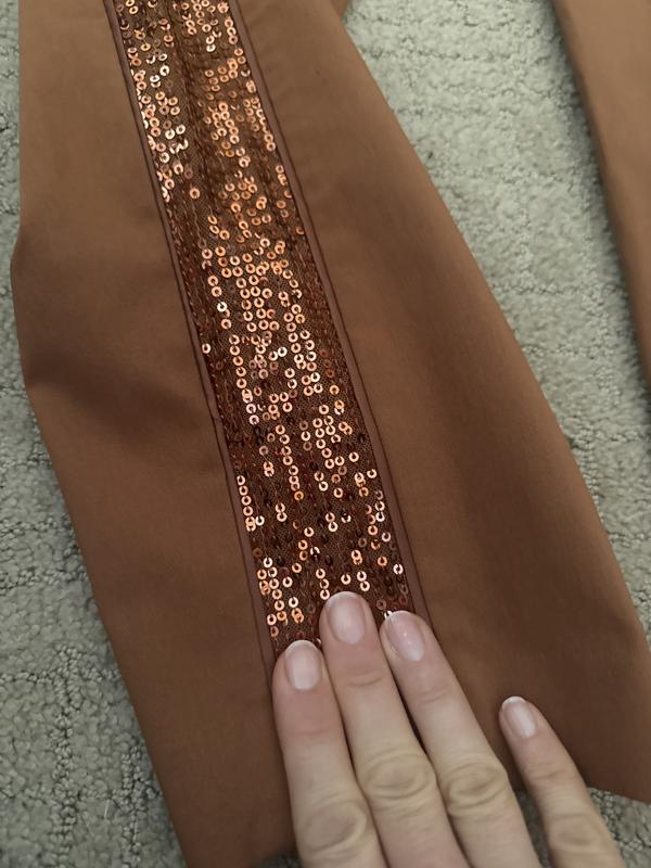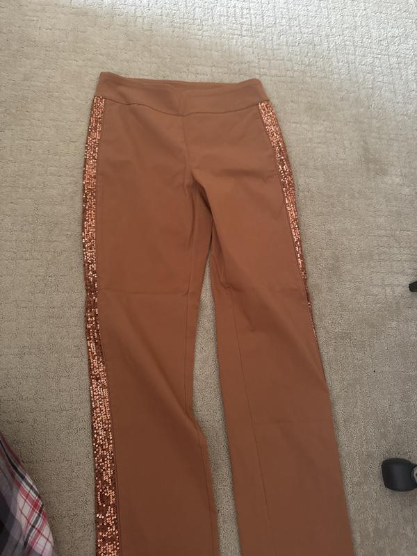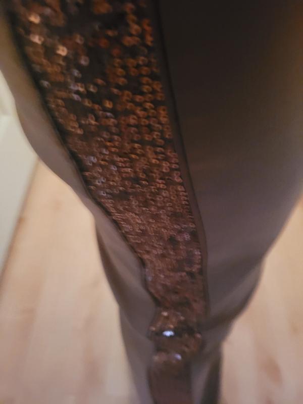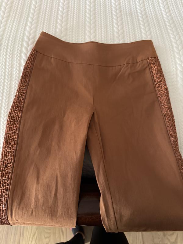 Brown stretchy fabric with sequin stripe on the outside. The fabric is comfortable and the pants slip on. However, the color and cut of the pants are not flattering. They have an awkward fit. It is a burnt amber color. Personally they feel dated with out of place sequin/sparkle placement. I think it would be better if the color was darker.