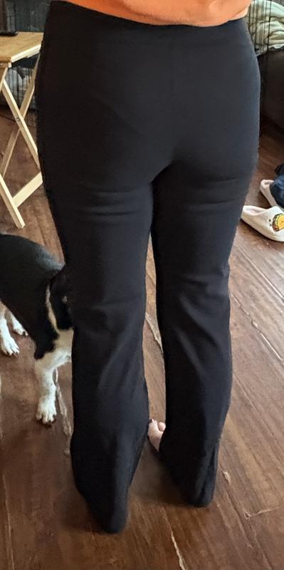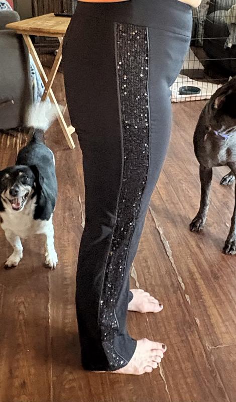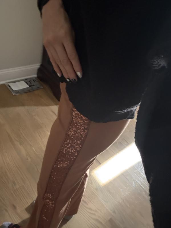 I love the fit of these pants. I am 5’4” and the length is perfect. I feel like they run large! I was early able to fit into an extra small and I am a size 5-7. The only thing I would change about these pants are the glitter down the sides. I can’t help but think they look like band pants. They have plenty of stretch. You can move around in these really well. They are a great pant for the holidays!