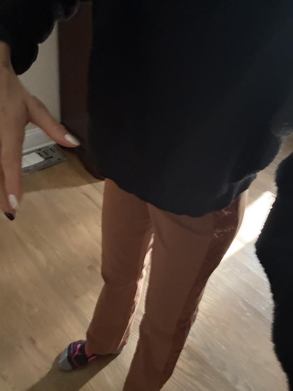 These pants are extremely comfortable. The elastic waistband is not too tight. I love that I can dress them up or down. And you cannot feel on the inside the sequins going down the side of the pants. The fit is perfect not too small or large. I will definitely be wearing these a lot this season!