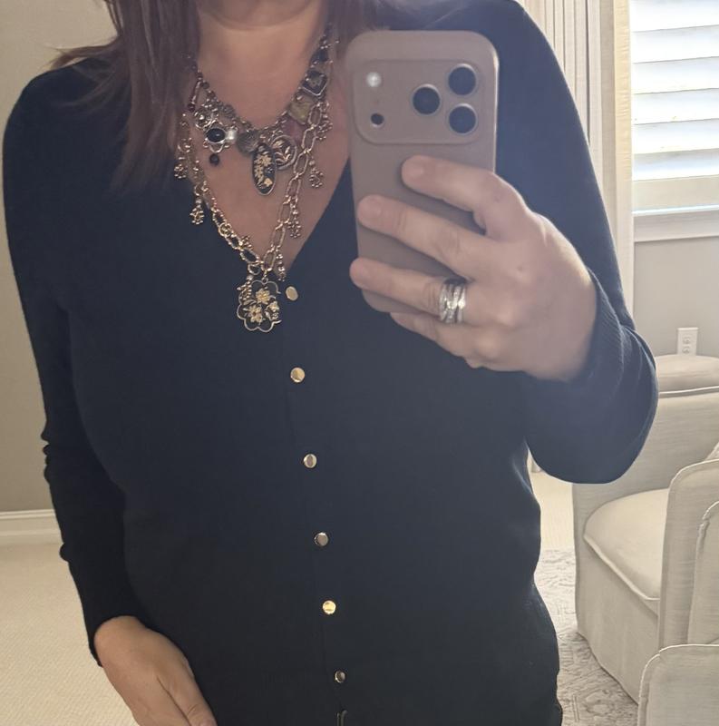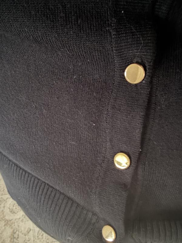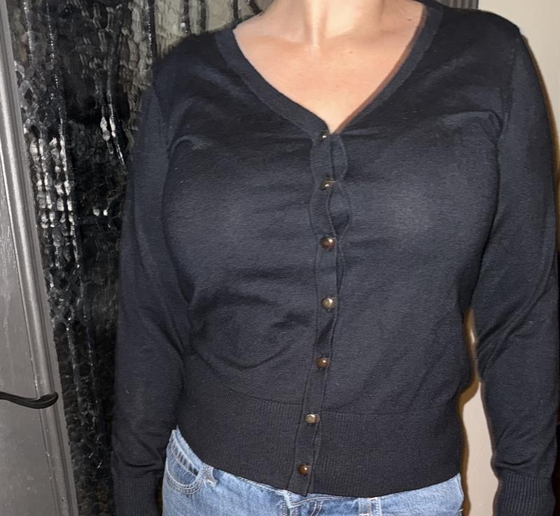 I love this black lightweight cardigan. The material is soft, smooth, and has a comfortable stretch that makes it easy to wear all day. Even though it’s lightweight, it still feels cozy without being bulky, which makes it a perfect layering piece for any season. The fit is flattering and skims the body nicely without feeling tight or stiff. One of my favorite details is the gold buttons, they instantly elevate the look and give the cardigan a polished, designer feel. They stand out beautifully against the black fabric and make the piece look far more expensive than it is. The ribbed cuffs and hem add a nice touch of structure, and the overall quality feels durable and well-made. I have worn this cardigan with so many outfits. It holds its shape well and doesn’t sag or stretch out throughout the day. This is a versatile, elegant, and easy-to-style cardigan that I find myself reaching for constantly. I highly recommend it if you want something classic, comfortable, and polished.