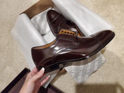 I bought several pairs of this particular shoe about a month ago and I have been wearing them around the house, breaking them in. The overall leather uppers may be a bit thinner than what I'm used to (I have another pair of J&M Meltons), but the shine gloss on these shoes is beautiful, and in my opinion, simple, restrained and elegant. One bonus of having thinner leather uppers - they seem to be breaking in quite fast, too.