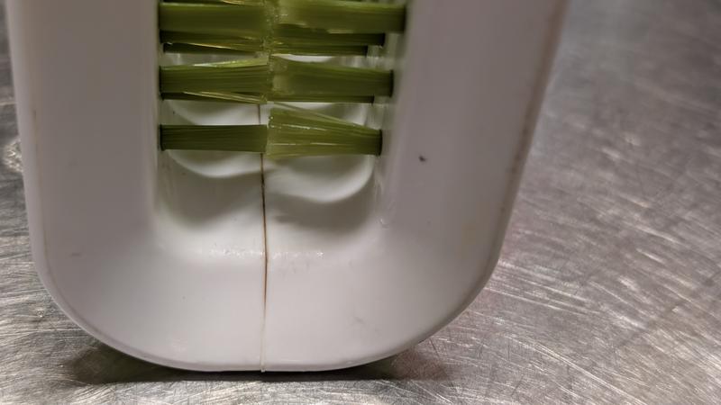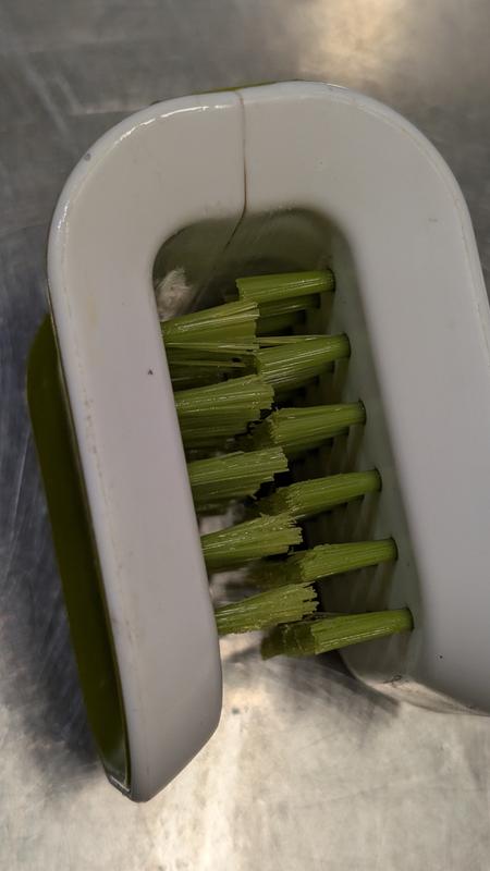 This is a handy tool that I would recommend to anyone. The Good: Dual brushes clean both sides of the knife at the same time. Bristles do not harm the finish on the blades. Design helps reduce the risk of cutting yourself. Also great for cleaning girls, spoons, etc.. Stands up neatly on the sink when not in use. The Bad: NOT dishwasher safe according to the Joseph Joseph website. The seam behind the brushes gets dirty and is hard to clean.