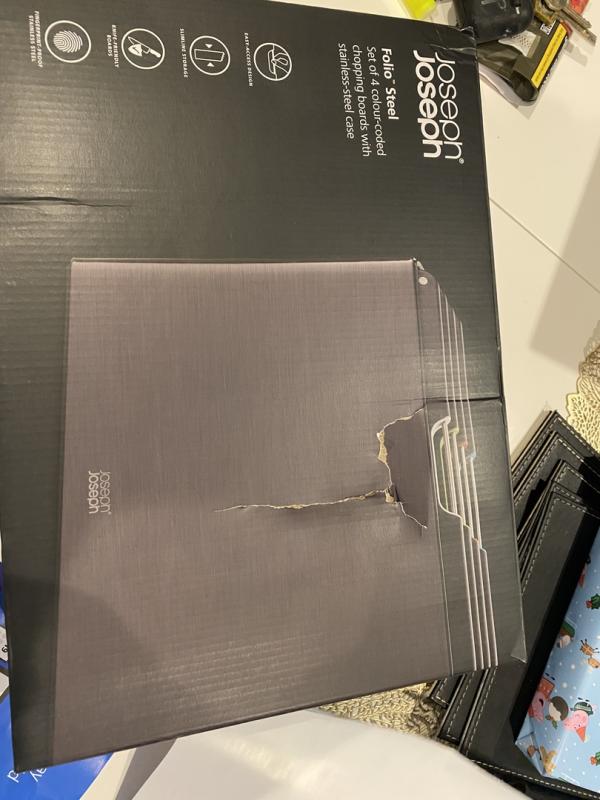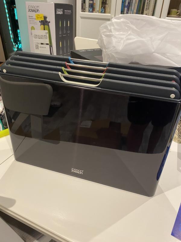 The rose gold cover for this chopping boards set blended beautifully in my kitchen. Unfortunately the finish of the individual chopping boards was disappointing. The edges where there handles joined the board were rough and the colour coding was poor. Not what I expected from Joseph Joseph as I have purchased other excellent items in the past. Chopping boards returned with no problem for a full refund.