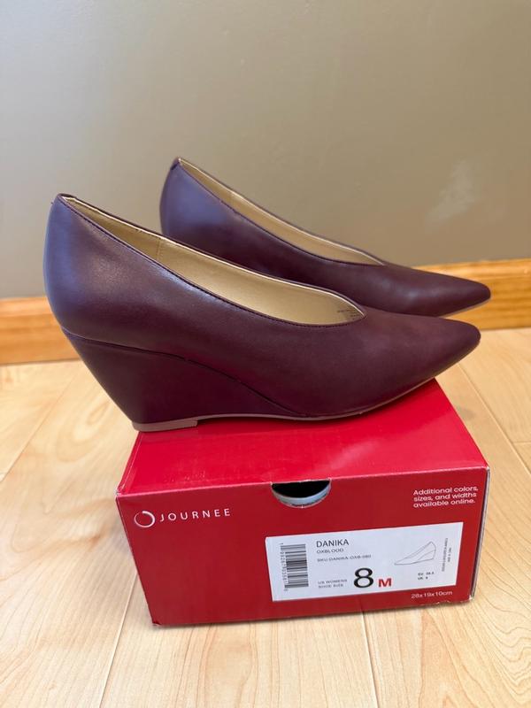 These Journee Danika dress wedge heels in the color oxblood are super comfortable. They have a stylish pointed toe and are perfect for the office. They are padded inside and feel very sturdy and well made. The sizing is on point as well. Thank you Influenster and Journee for the complimentary pair!