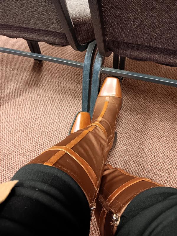 Love the boots, material, and especially the fit. The red is to die for. They are so comfortable. I love them so much I ordered all the colors in my size. True to size.